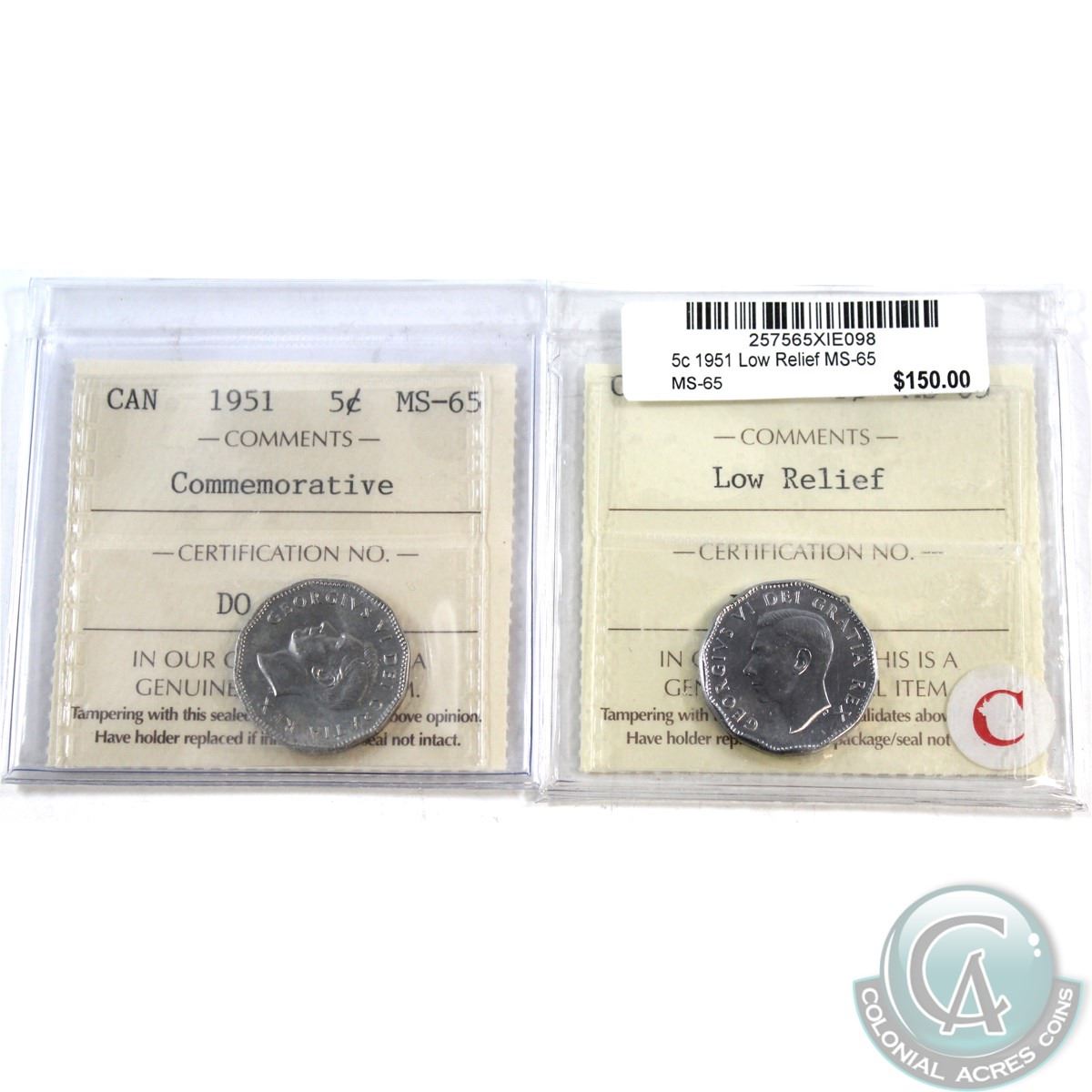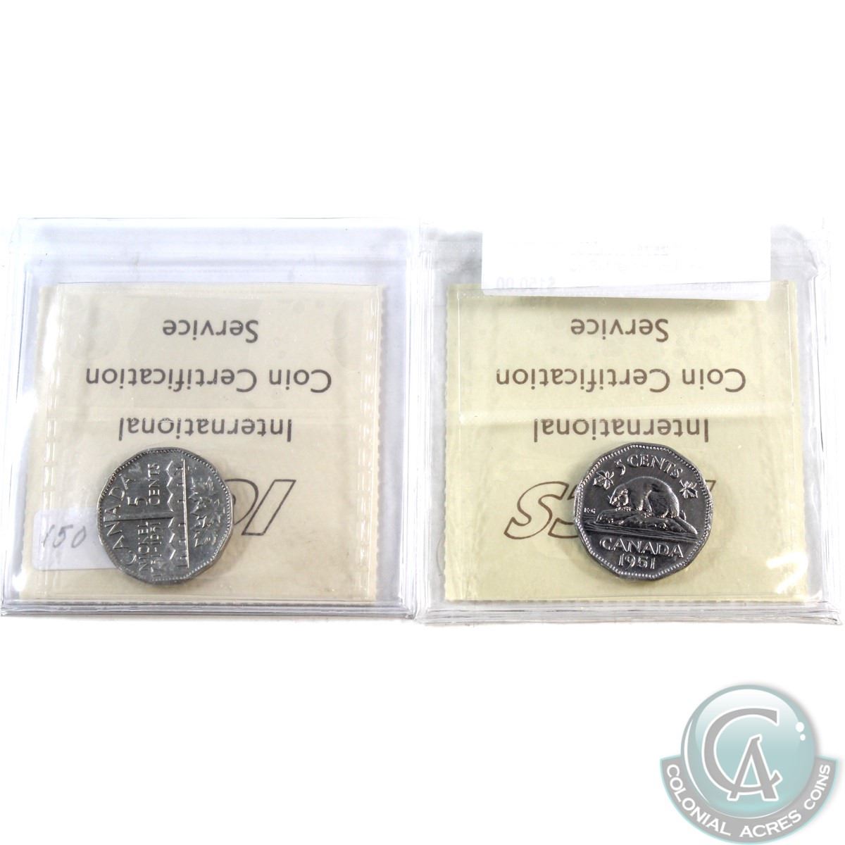 5-cent 1951 Low Relief & 1951 Commemorative ICCS Certified MS-65. 2pcs