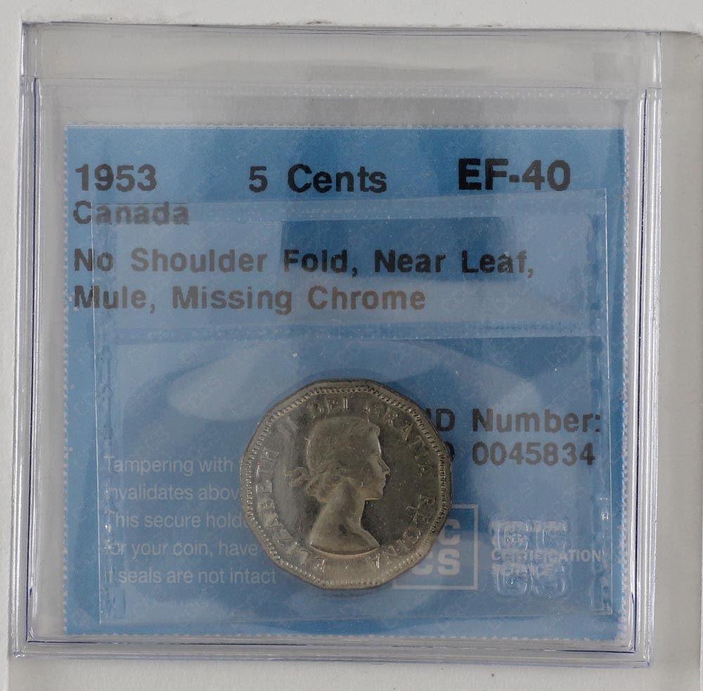 5-cent 1953 CCCS EF40, NSF, Near Leaf (mule) Missing Chrome