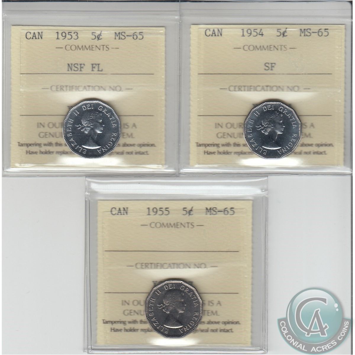 5-cent 1953 NSF FL, 1954 SF & 1955 ICCS Certified MS-65. 3pcs
