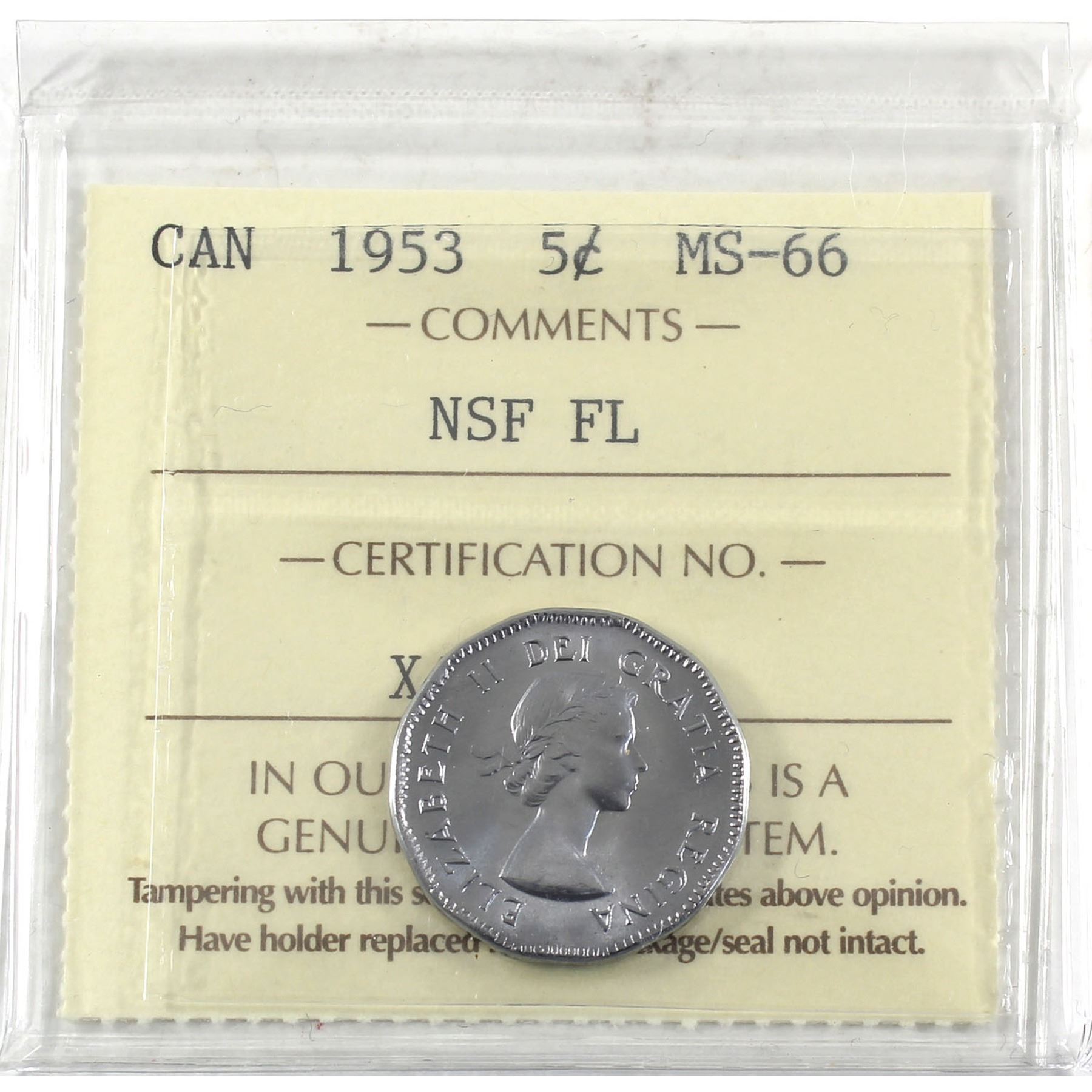 5-cent 1953 NSF Far Leaf, ICCS Certified MS-66. Flashy coin with exceptional eye appeal.
