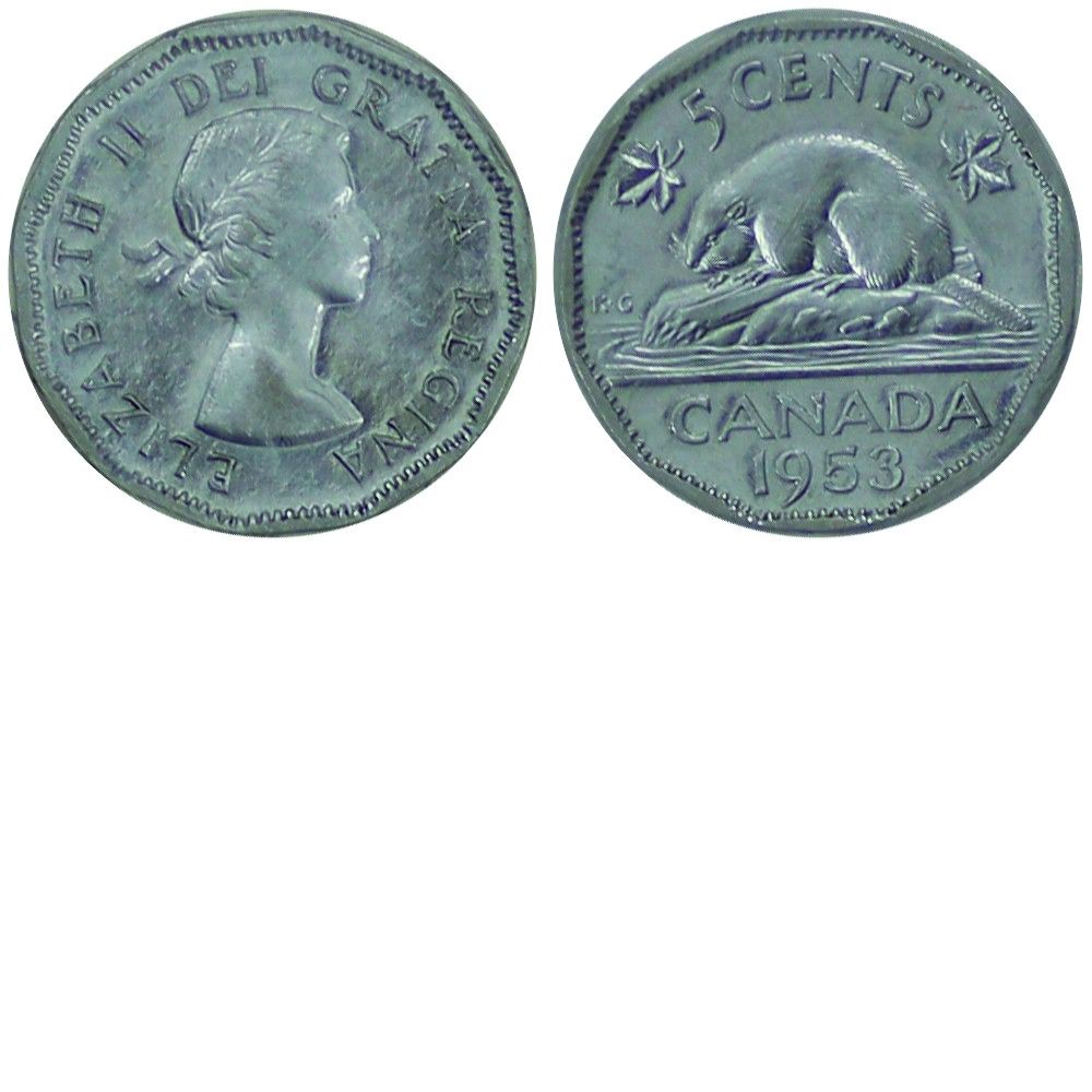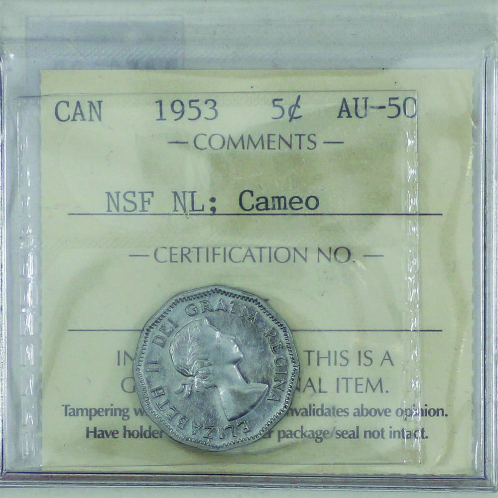 5-cent 1953 NSF NL; Cameo "MULE" ICCS Certified AU-50. A nice clean rust free example of this variety.
