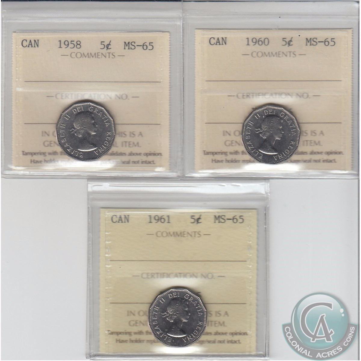 5-cent 1958, 1960 & 1961 ICCS Certified MS-65. 3pcs