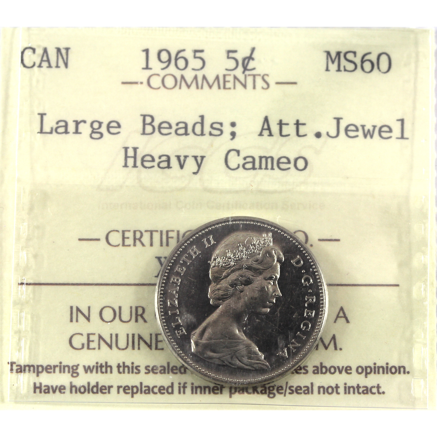 5-cent 1965 Large Beads; Att. Jewel ICCS MS60 Heavy Cameo