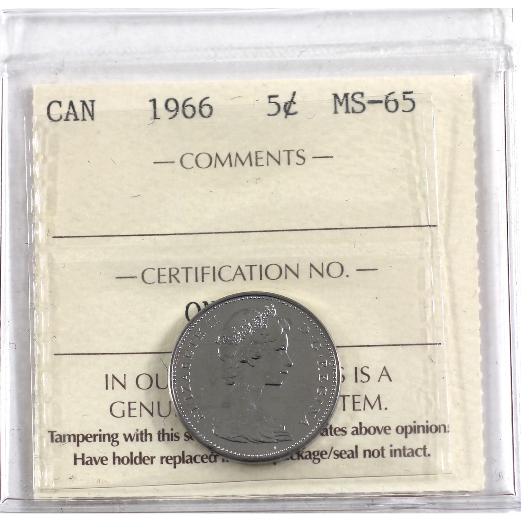 5-cent 1966 ICCS Certified MS-65. A bright coin with a mirror like finish.