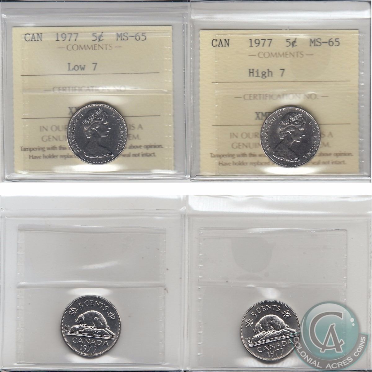 5-cent 1977 Low 7 & High 7 ICCS Certified MS-65. 2pcs
