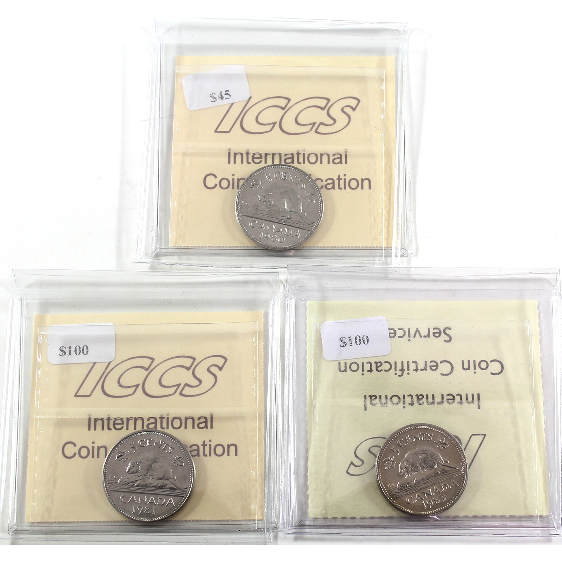 5-cent 1980, 1981, & 1983 ICCS MS65. 3pcs.