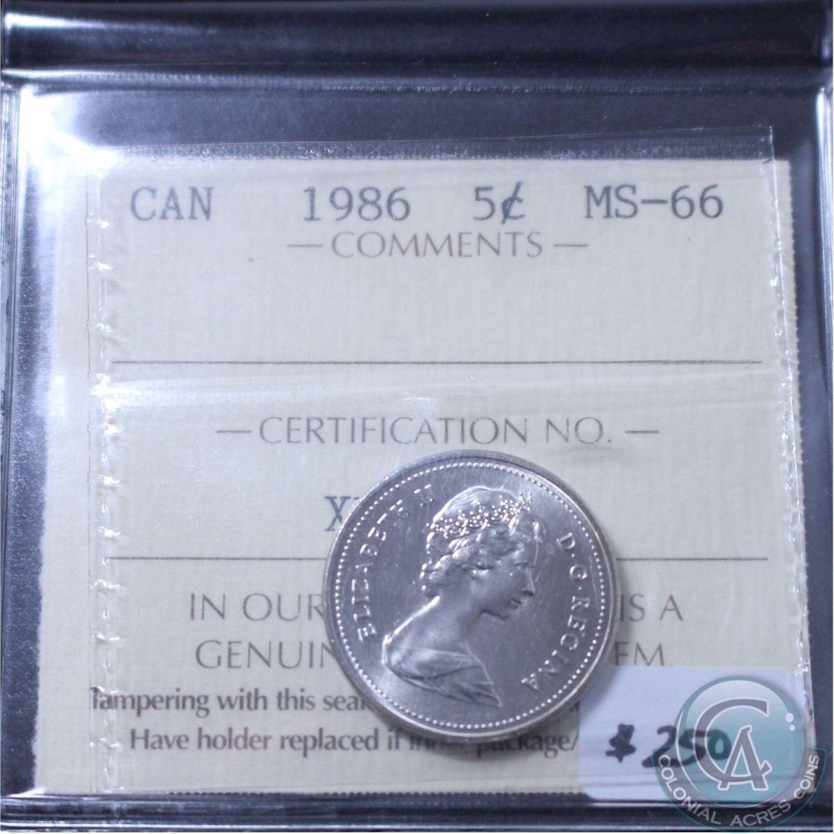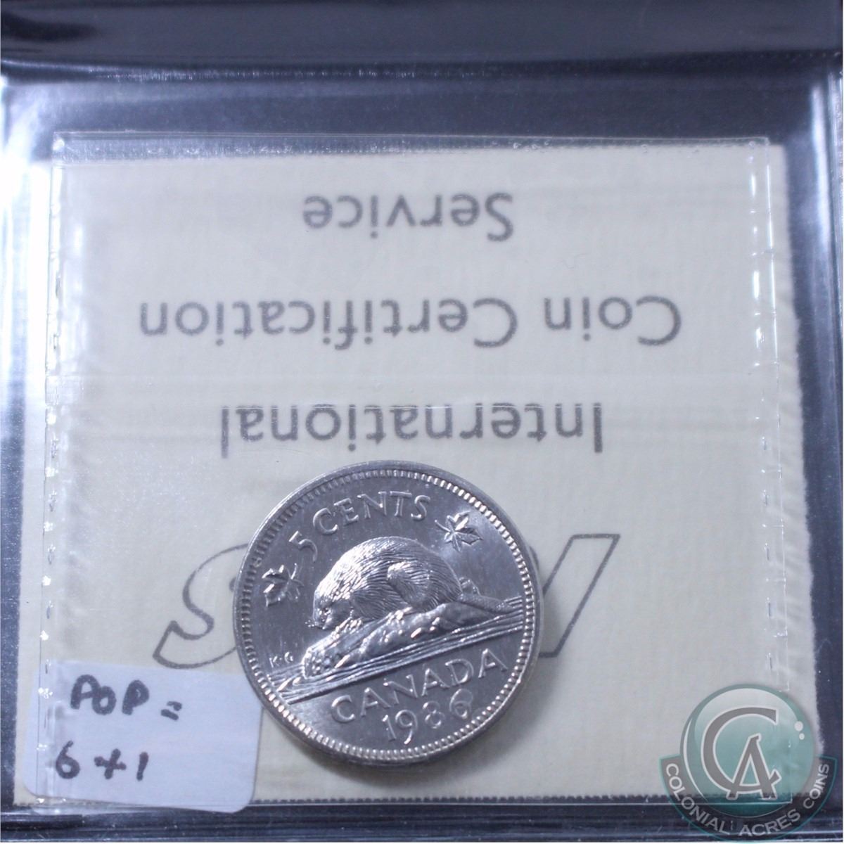 5-cent 1986 ICCS Certified MS-66! A Rare coin in this grade with only 6 coins ever graded MS-66 and 1 graded higher.