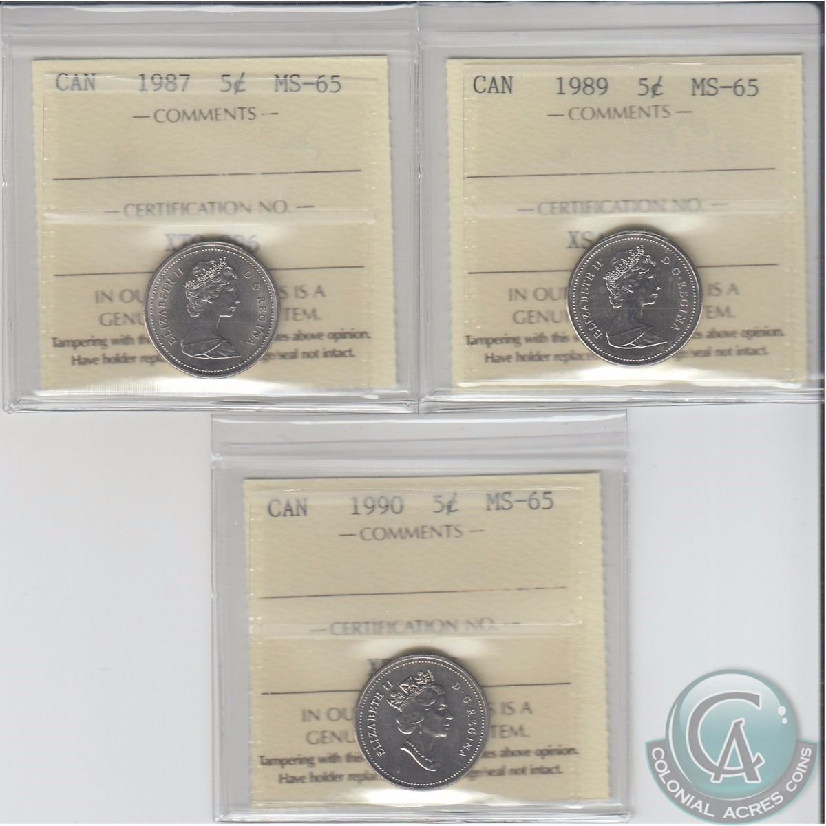5-cent 1987, 1989 & 1990 ICCS Certified MS-65. 3pcs