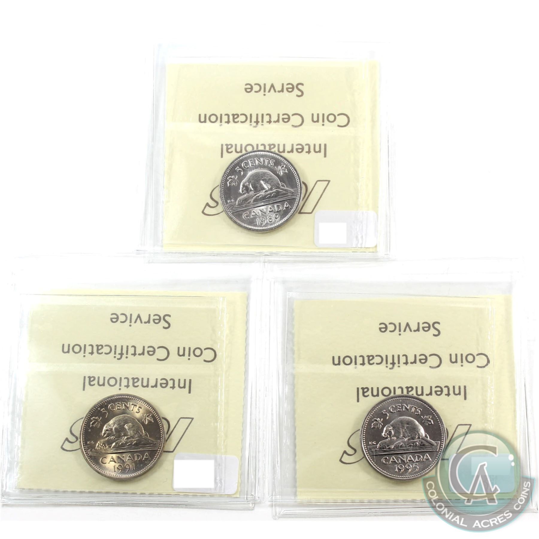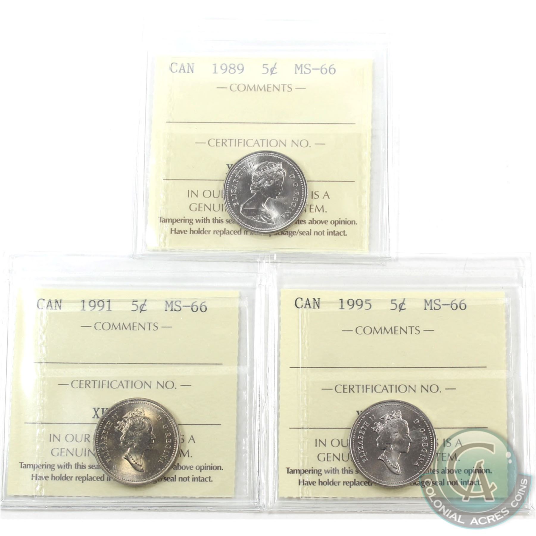 5-cent 1989, 1991 & 1995 ICCS Certified MS-66. 3pcs