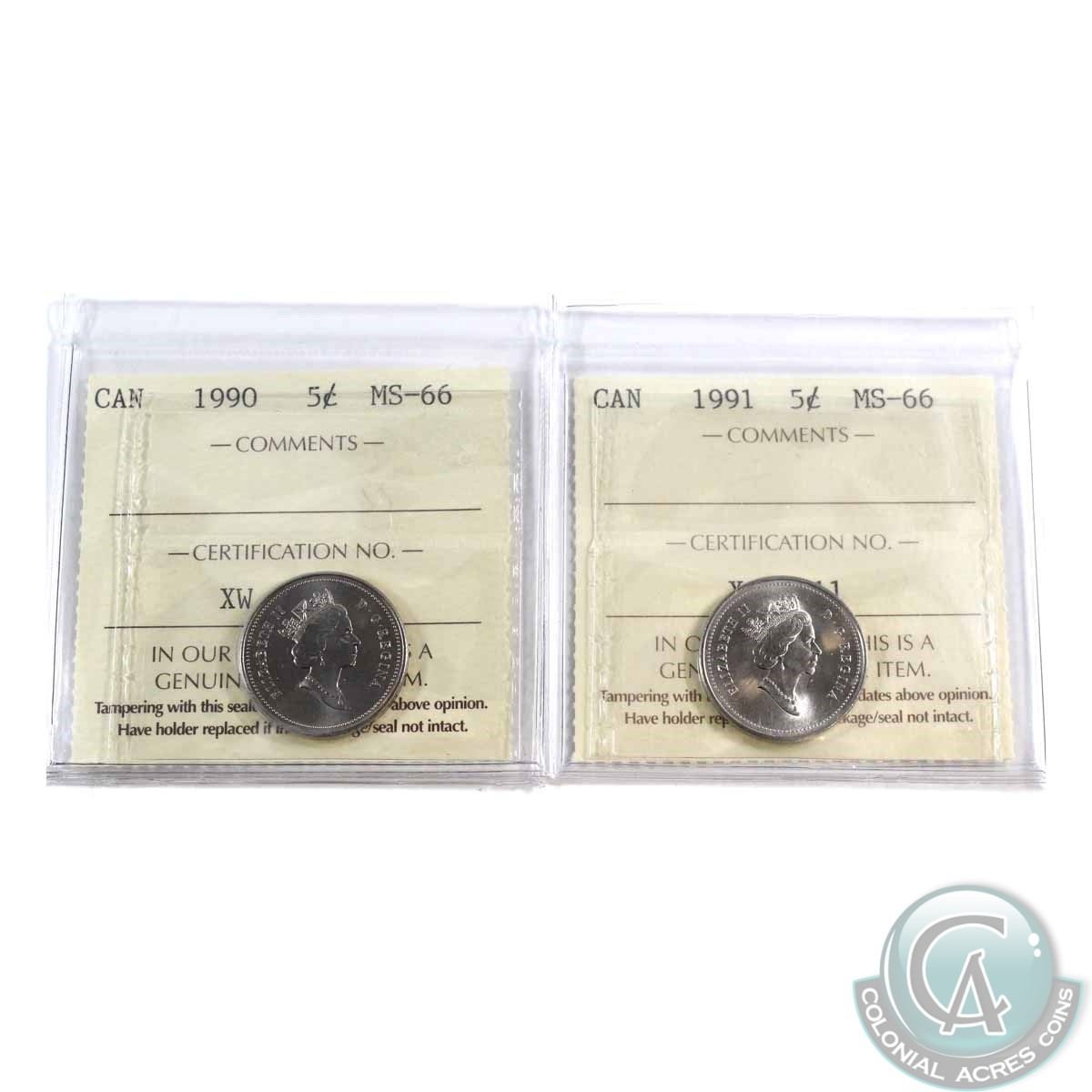5-cent 1990 & 1991 ICCS Certified MS-66. 2pcs