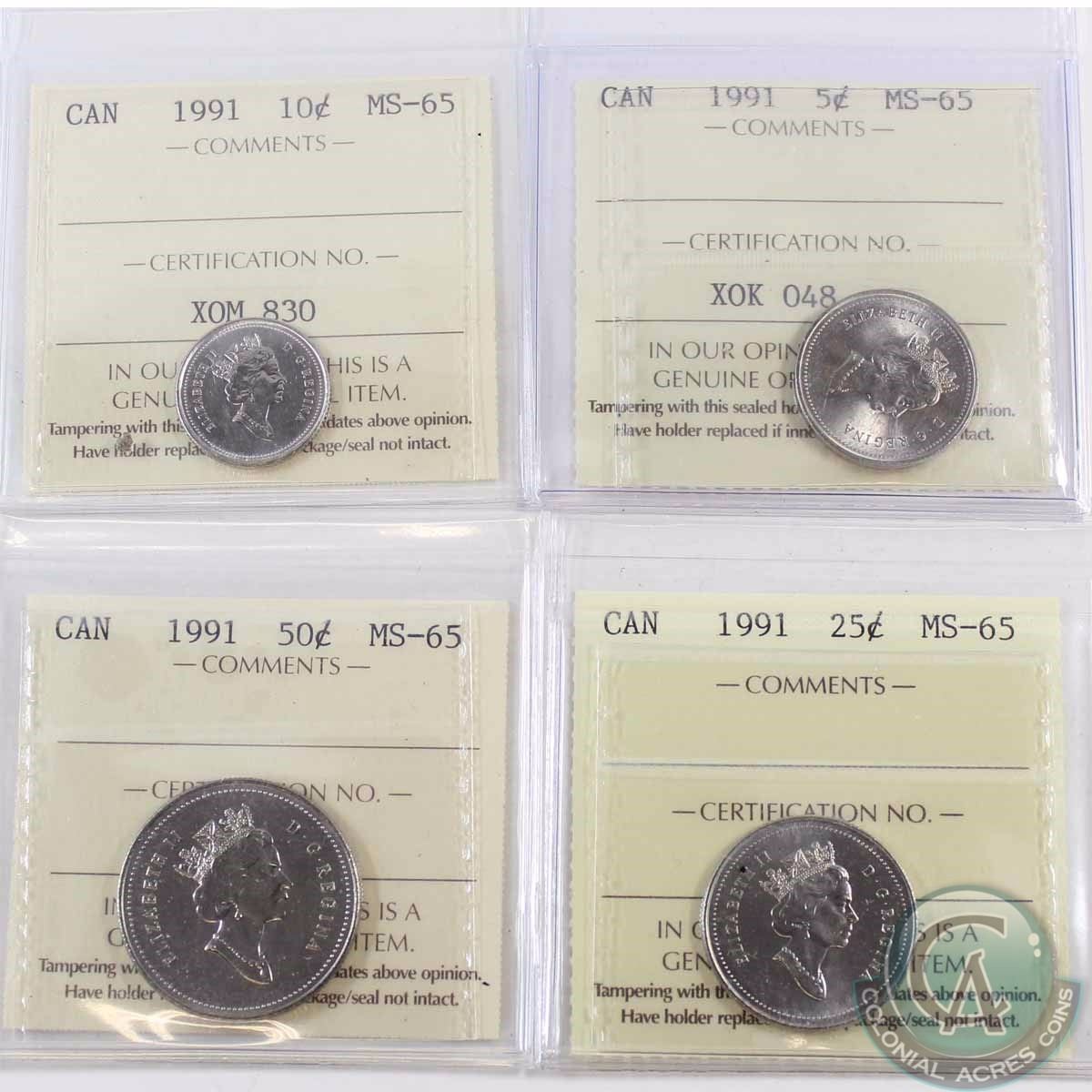 5-cent 1991, 10-cent, 25-cent & 50-cent ICCS Certified MS-65. 4pcs