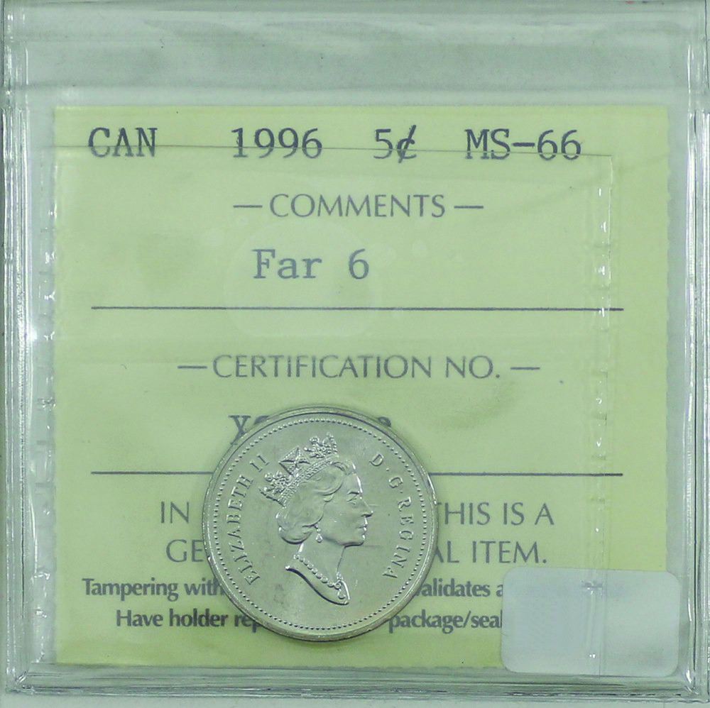 5-cent 1996 Far 6, ICCS Certified MS-66! TOP 10! Highest grade by ICCS!