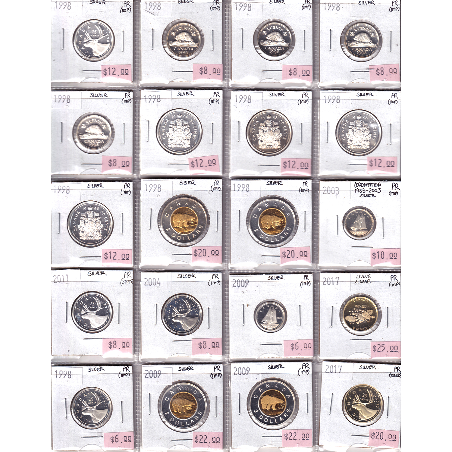 INCLUDES: 25-cent 1998 silver PR (impaired), 10-cent 1953-2003 Coronation silver PR (impaired), $2 2009 silver PR (impaired), & more! Sold as is; please see images for details. 20pcs.