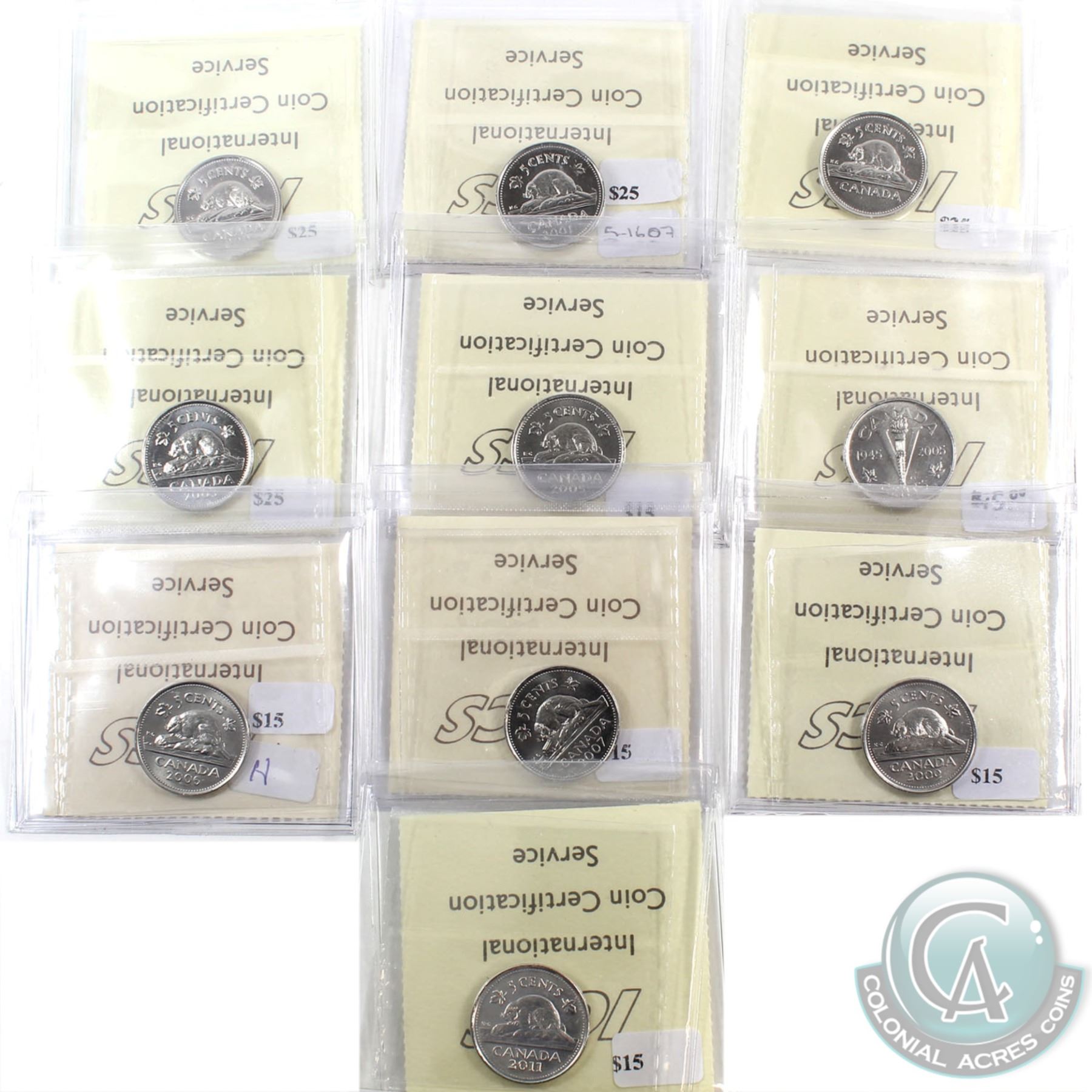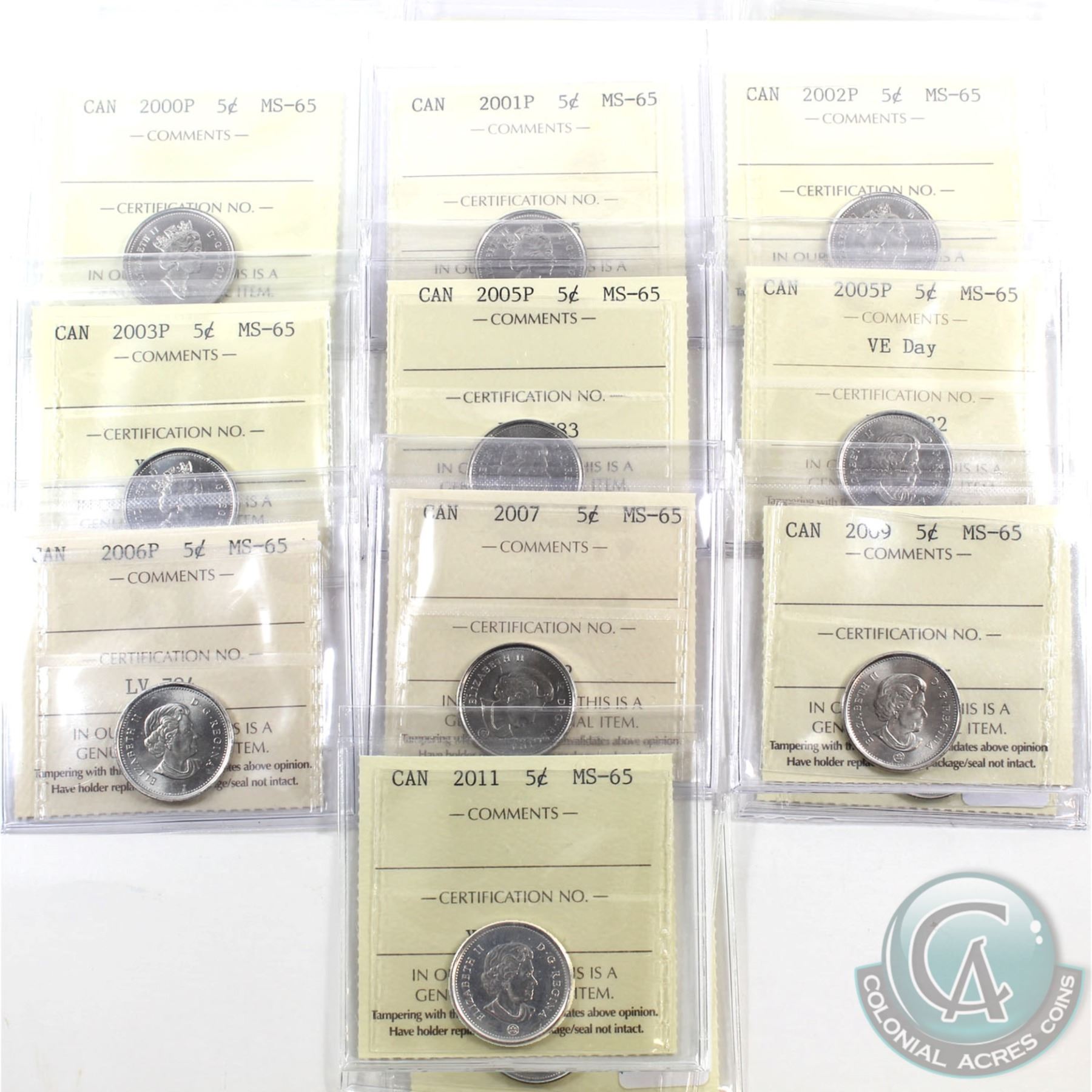 5-cent 2000P, 2001P, 2002P, 2003P, 2005P, 2005P VE Day, 2006P, 2007, 2009 & 2011 ICCS Certified MS-65. 10pcs