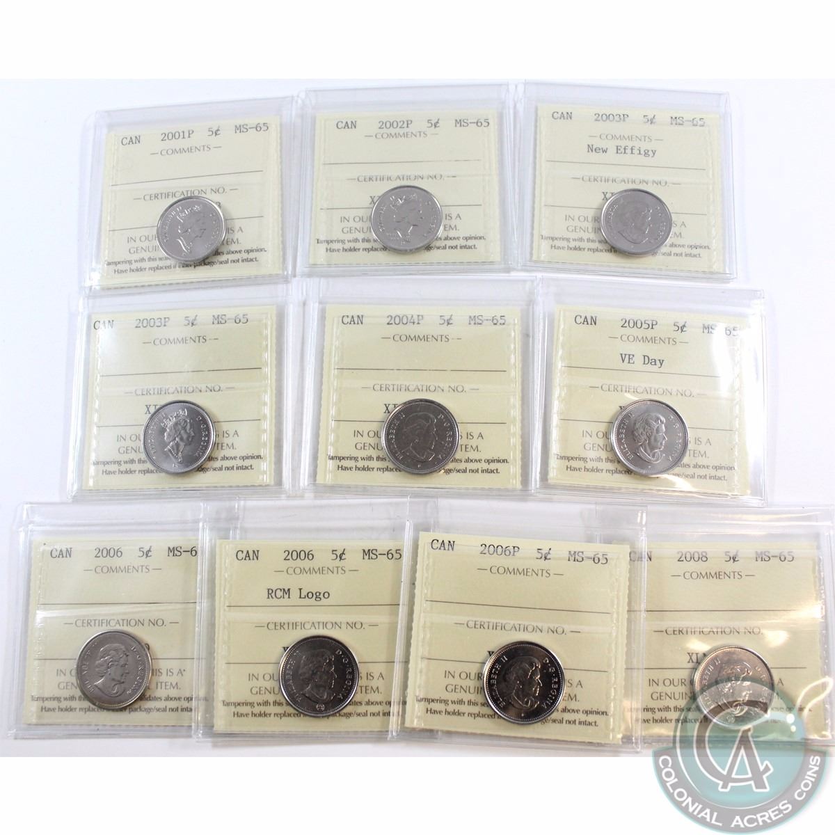 5-cent 2001P, 2002P, 2003P New Effigy, 2003P, 2004P, 2005P VE Day, 2006, 2006 RCM Logo, 2006P, 2008 ICCS Certified MS-65. 10pcs.