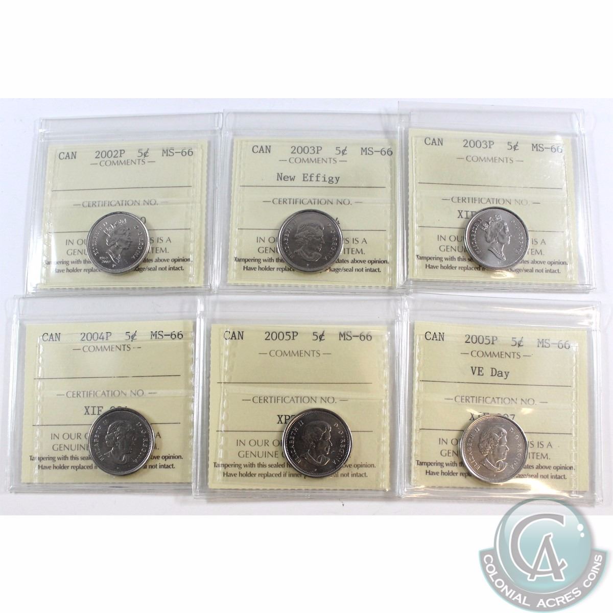 5-cent 2002P, 2003P New Effigy, 2003P, 2004P, 2005P, 2005P VE Day ICCS Certified MS-66. 6pcs.