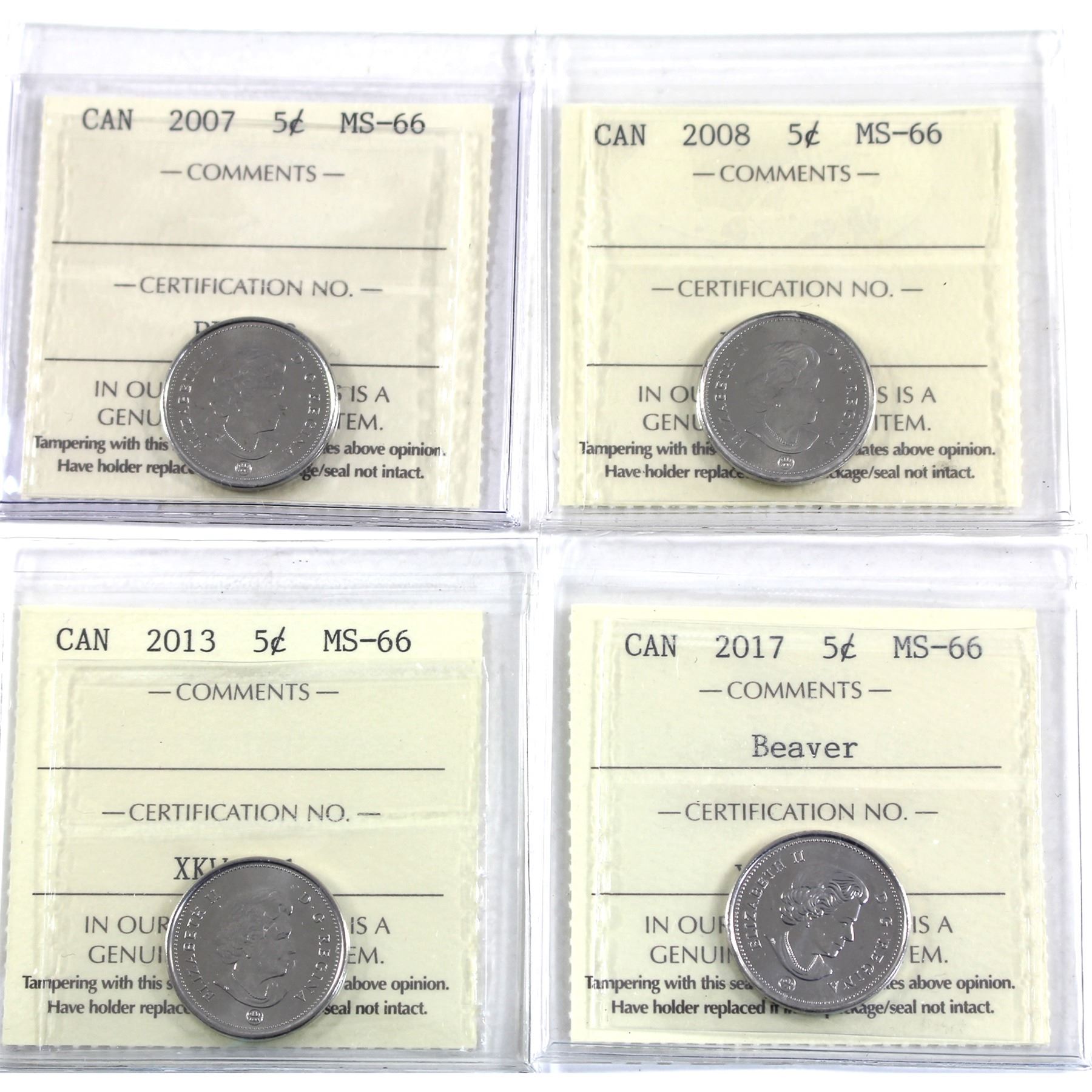 5-cent 2007, 2008, 2013, 2017 Beaver ICCS Certified MS-66. 4pcs.