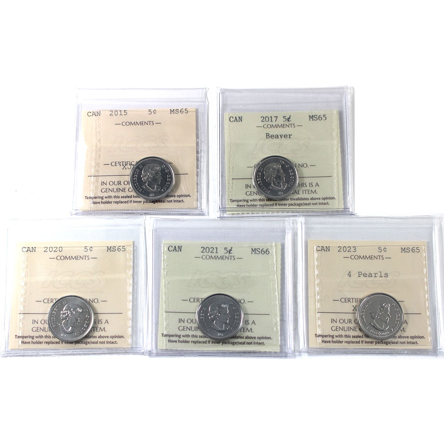 5-cent 2015-2023 ICCS MS65-66. INCLUDES: 2015 MS65, 2017 Beaver MS65, 2020 MS65, 2021 MS66 & 2023 4 Pearls MS65. 5pcs.