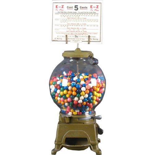 5 cent EZ Gum ball machine original olive green paint w/barrel locks and two reproduction signs for the top card display