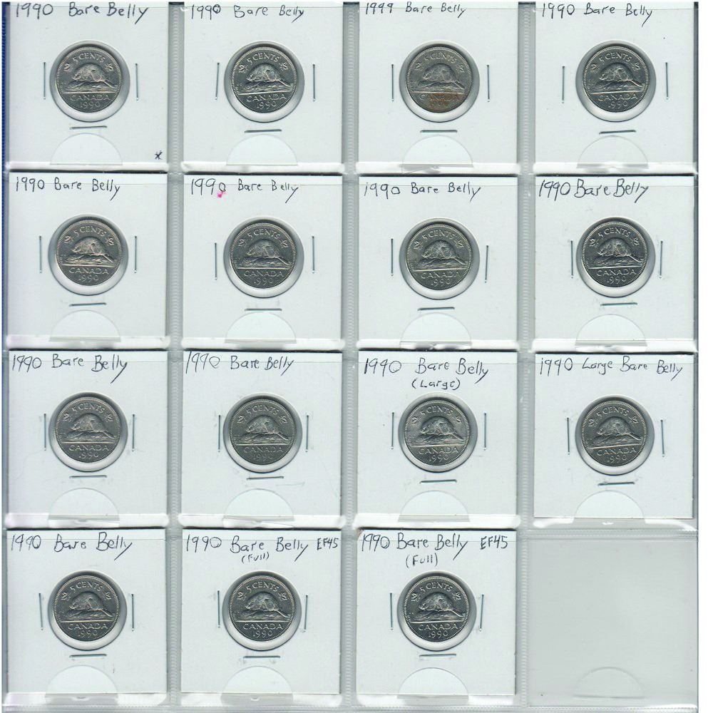 5-cent; Group Lot of 15x 1990 "Bare Belly" 5 cent Varieties. These example are medium to large types of this variety. Coins range from approximately VF-AU Condition.