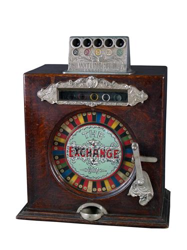 5 cent "Watling Exchange" Counter-top Wheel Slot w/key Original and complete