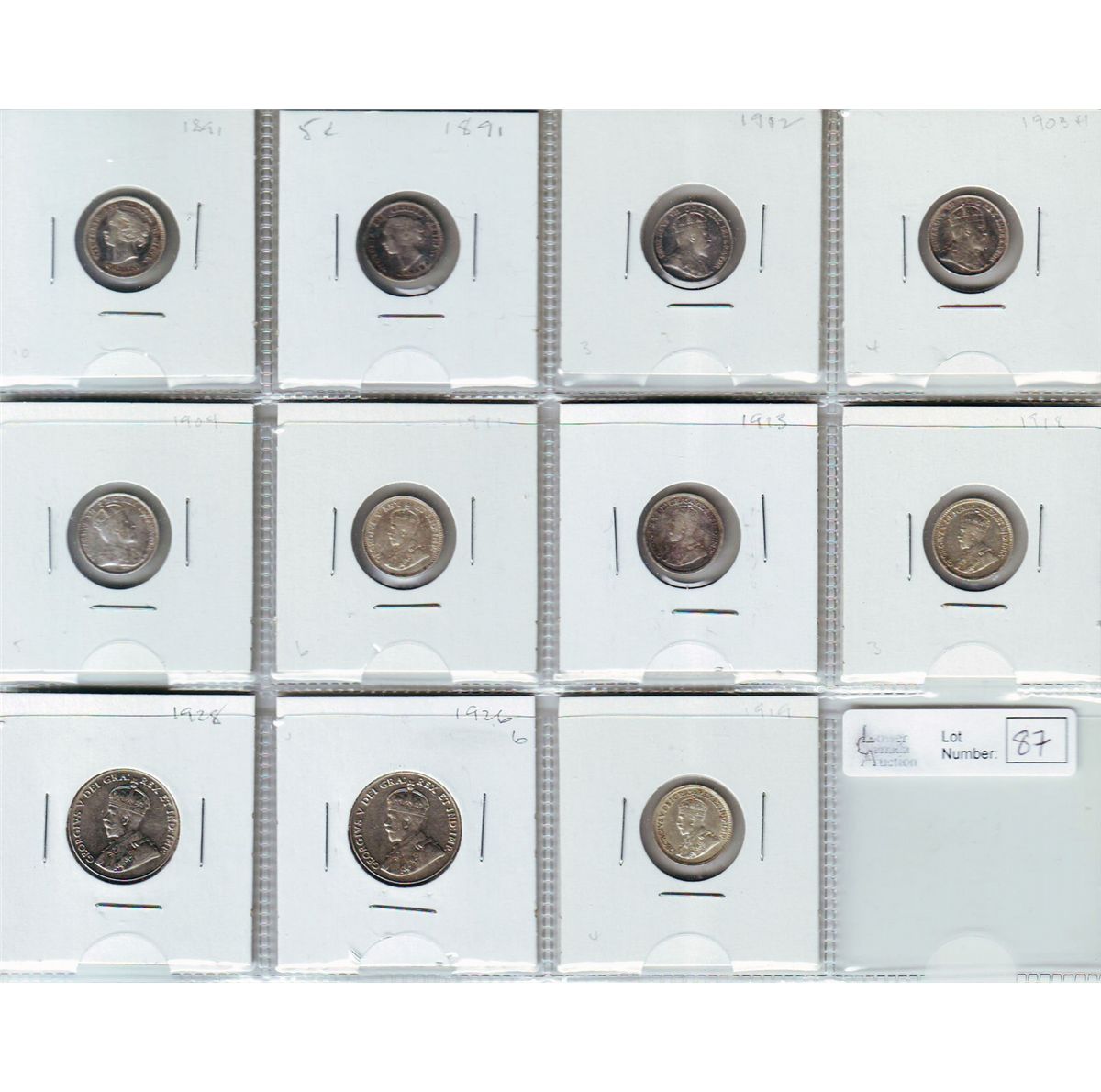 5 cents 1891 VG-10 and EF-40, 1902 VF-20, 1903H VF-20, 1904 F-12, 1911 VF-20, 1913 VG-8, 1918 F-12,