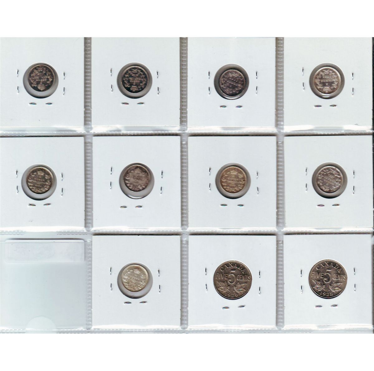 5 cents 1891 VG-10 and EF-40, 1902 VF-20, 1903H VF-20, 1904 F-12, 1911 VF-20, 1913 VG-8, 1918 F-12, 1919 F-12, 1926 Near 6 VF-30 & 1928 EF-40 . Lot of 11 coins.