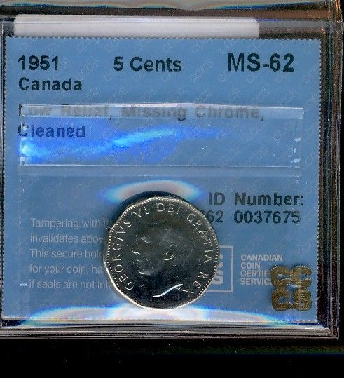 5 cents 1951 Low Relief, Missing Chrome CCCS MS-62. Designated cleaned.