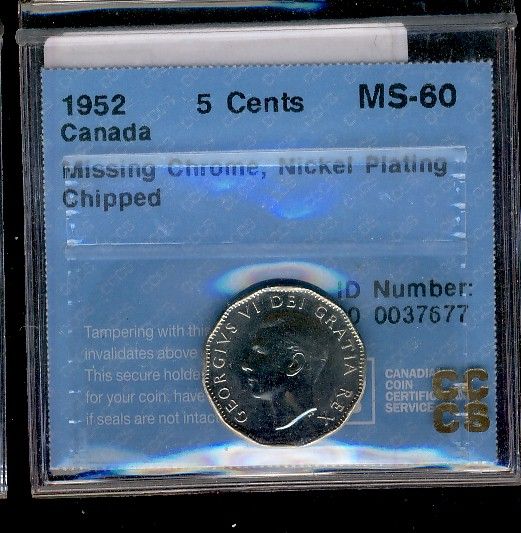 5 cents 1952 Missing Chrome CCCS MS-60. Designated nickel plating chipped.