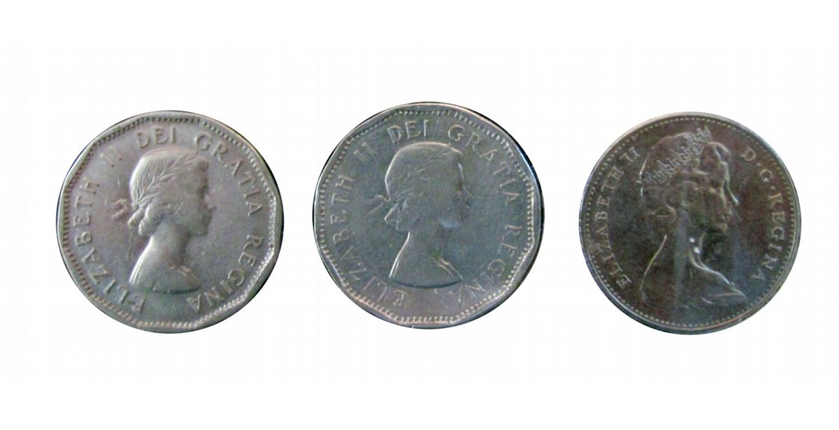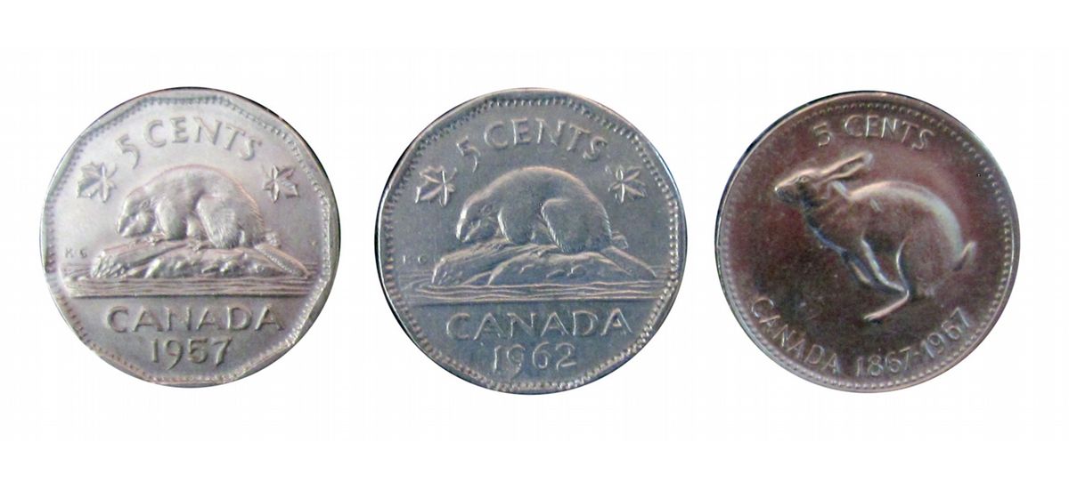 5 cents 1962 Re-engraved Date, 1957 Bugtail & 1967 Double Date. Lot of 3 coins.