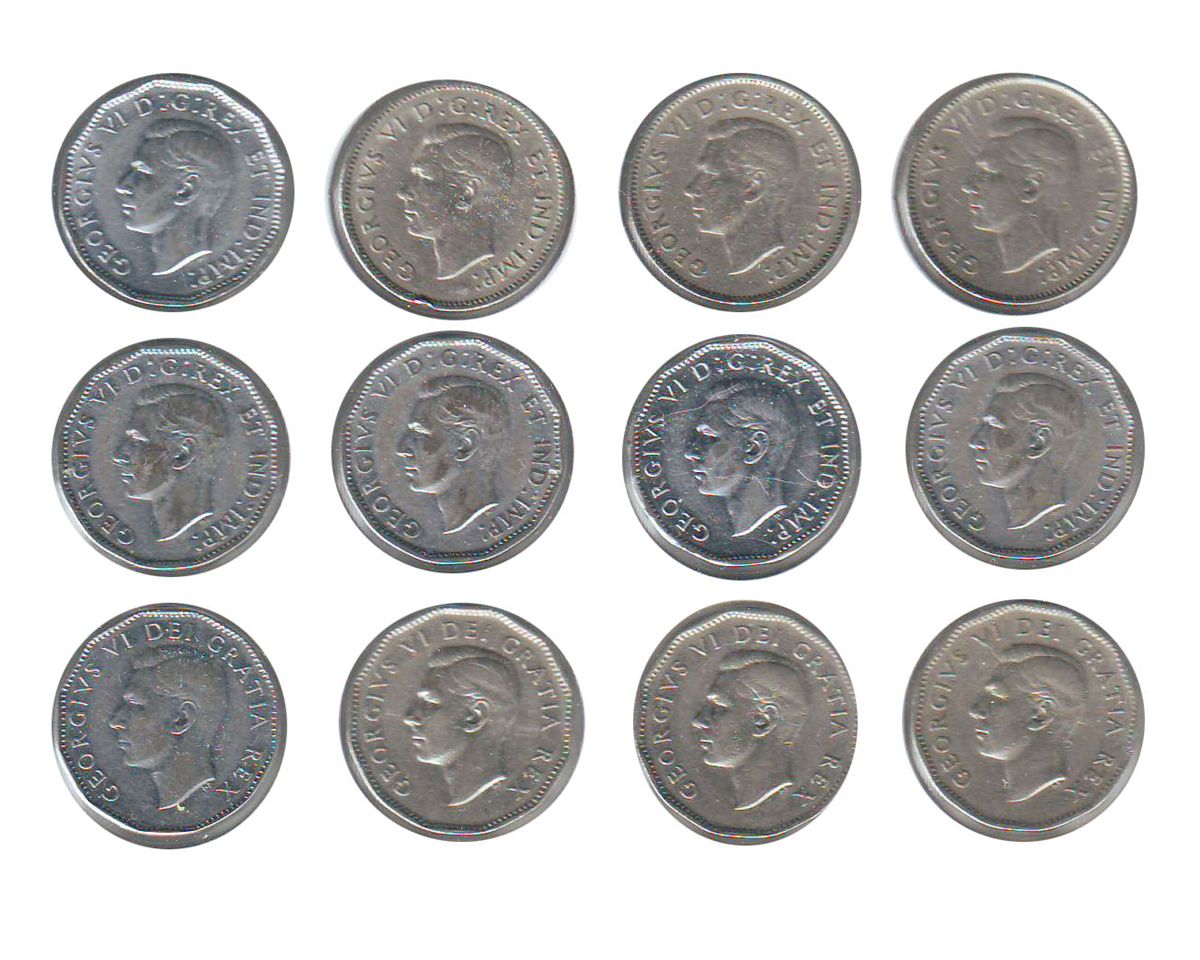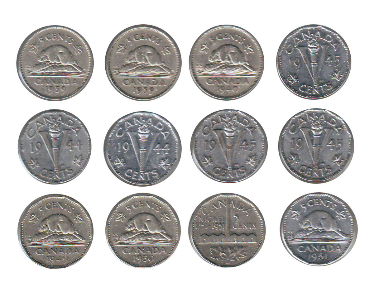 5 cents lot; 1939 x 2, 1940, 1944 x 2, 1945 x 3, 1949, 1950, 1951 LR & 1951 Commemorative, all circulated, all containing varieties; Die Clash, Die Break, Lump, Attached Letters, etc. Lot of 12 coins.