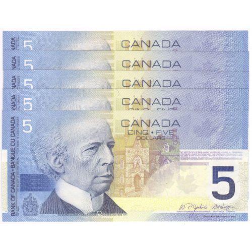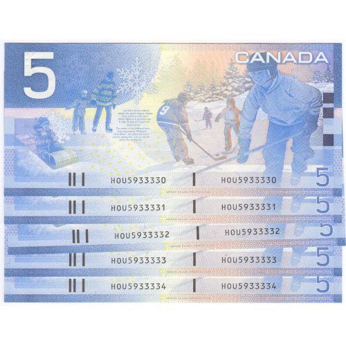 Bank of Canada, 5 consecutive $5.00 Insert notes 2005, grade Choice to Gem UNC, Charlton # BC-62bA, signature Jenkins Dodge, serial HOU5933330-31-32-33-34, insert range 5.900M - 6.000M. Problem free notes.