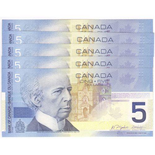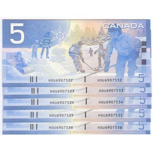 Bank of Canada, 5 consecutive $5.00 Insert notes 2005, grade Choice to Gem UNC, Charlton # BC-62bA, signature Jenkins Dodge, serial HOU6907532-33-34-35-36, insert range 6.860M - 7.000M. Problem free notes.