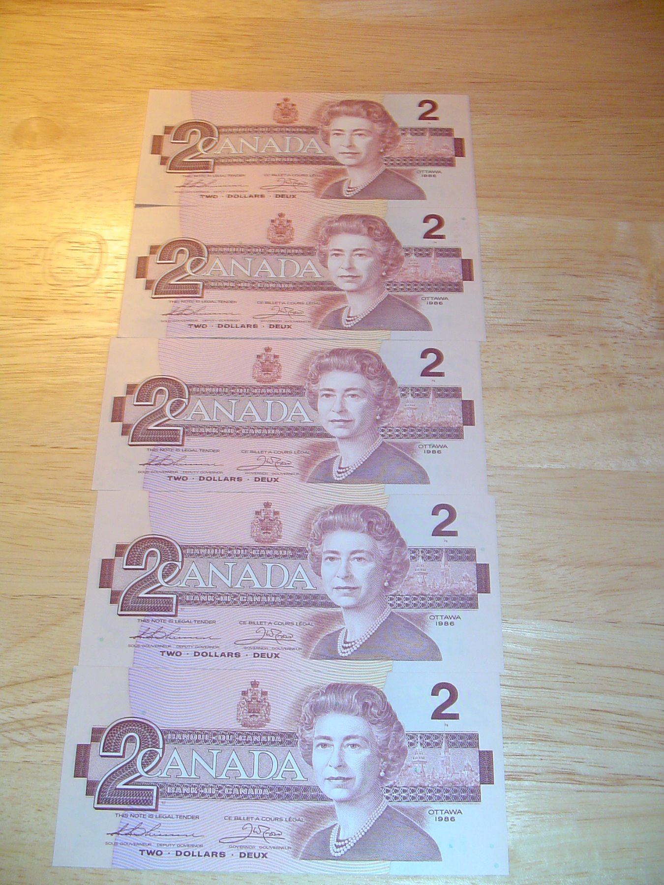 5 consecutive ser 1986 2 dollar bills uncirculated