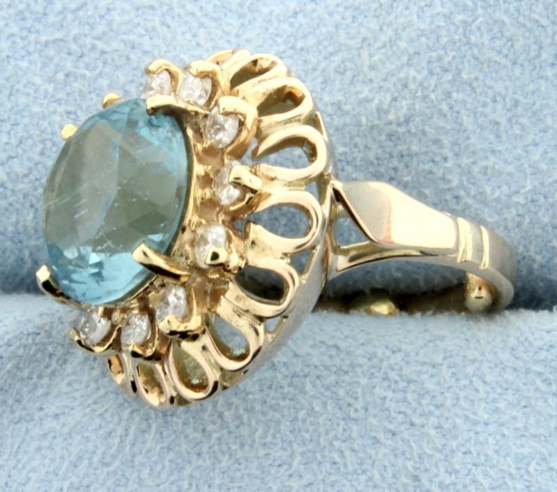 14 K yellow gold .6 ct TW of diamonds SI clarity, H color. 11.3mm round topaz approx. 5 cts. Has 2 sizing balls inside ring to stabilize it on finger. Size 4. 7.9g