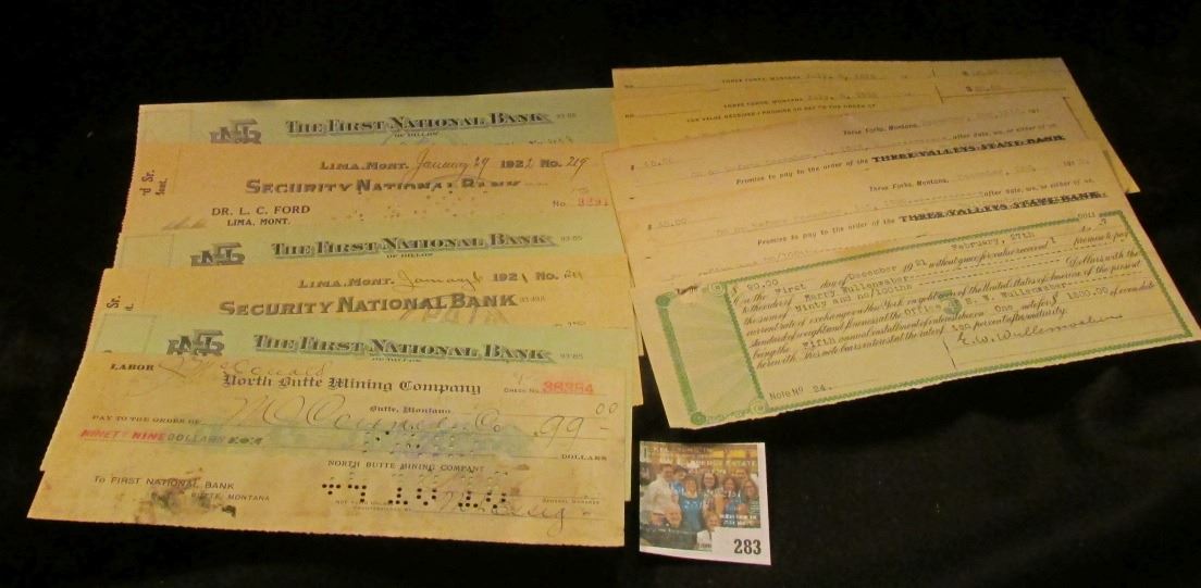 (5) different Promissory Notes for $20, $20, $45, $45, & $90 …in Gold Coin of the United States of America" (originated in Three Forks, Mont.); & (7) different early 1900 Montana Checks.