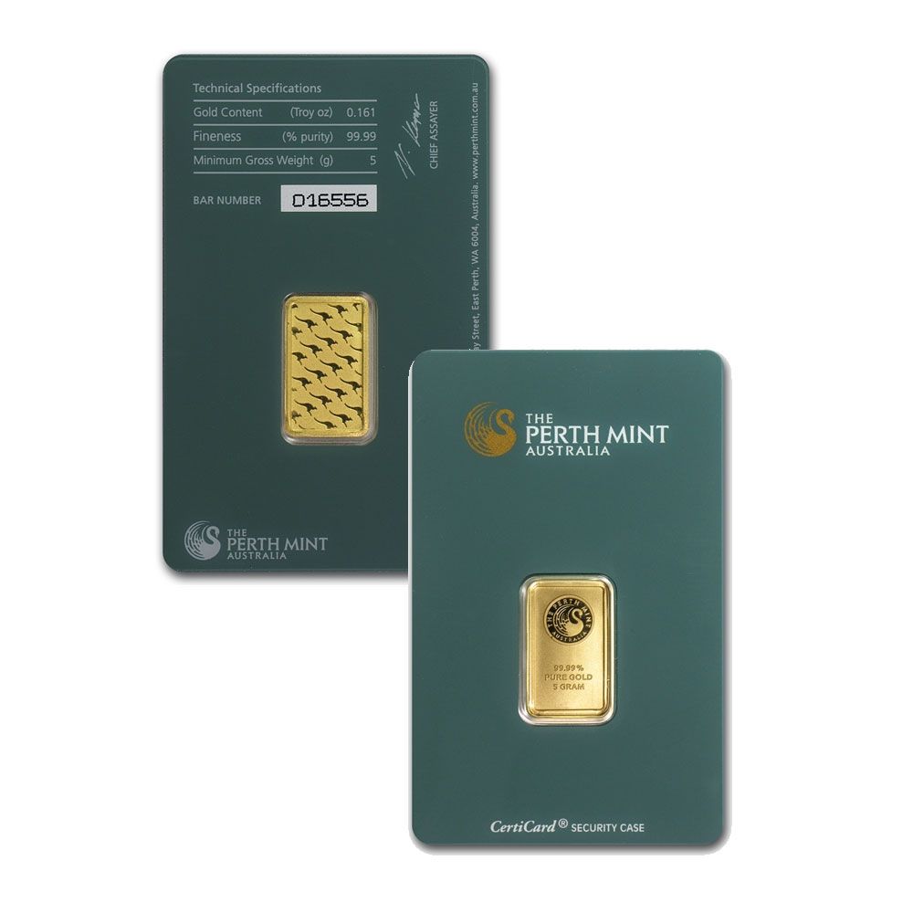 One piece 5 gram Perth Mint Gold Bar .9999 Fine Gold in Assay