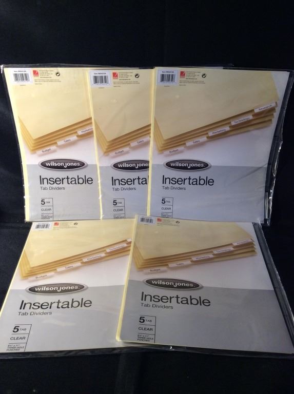 five tab clear 8 1/2“ x 11“ three hole punched