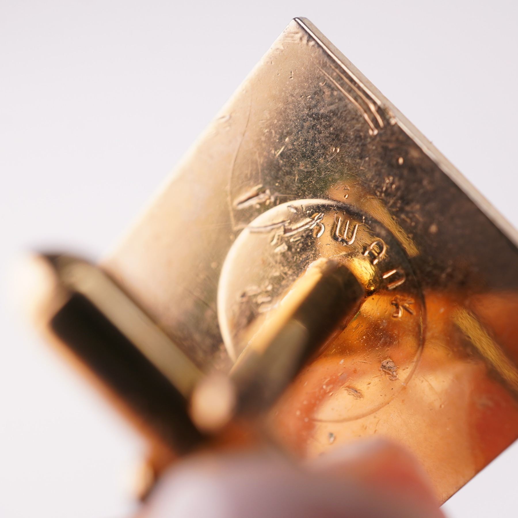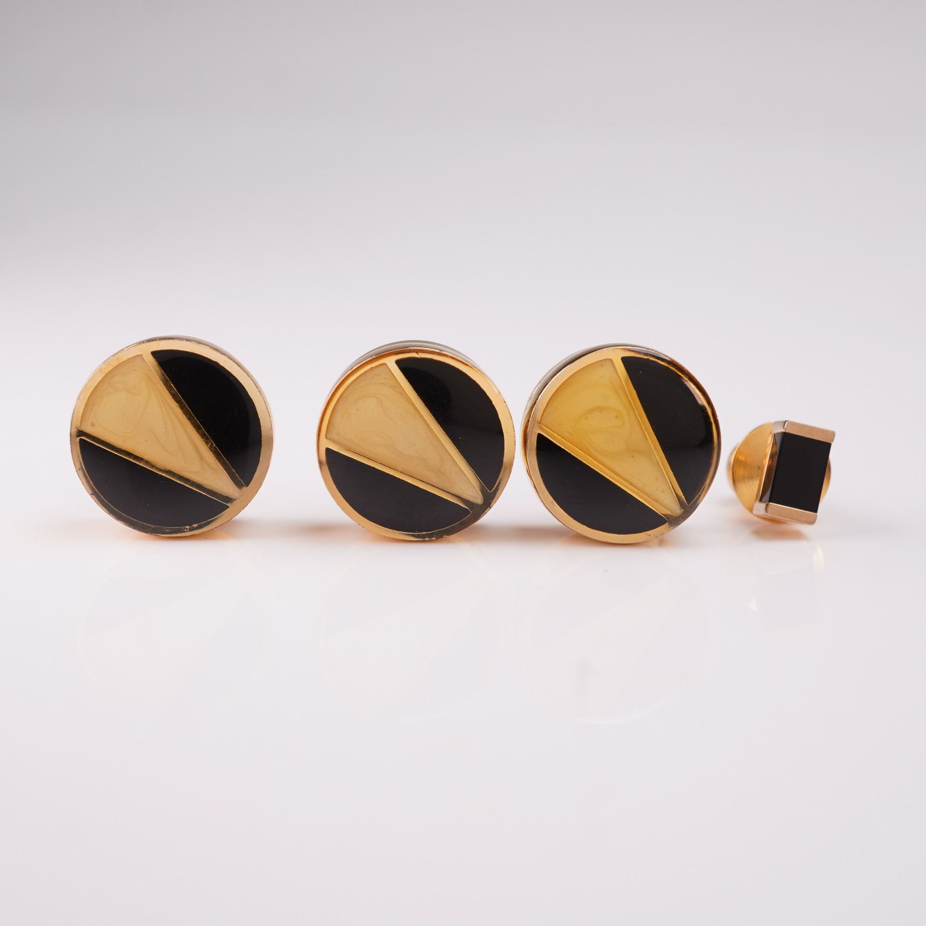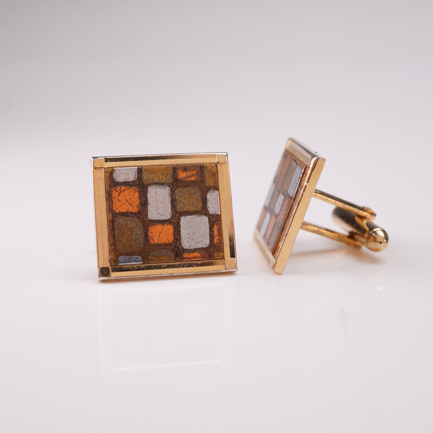 A distinguished men's accessory set featuring one tie pin, three button covers, and a pair of cufflinks. The pair of square cufflinks are signed Swank and display a striking mosaic-style design in warm hues of orange, silver, and gray within a gold-tone frame. Accompanying them are three round button covers and a tie pin, crafted in a bold geometric style with black and golden triangular inlays that echo mid-century modernist design. Together, the set offers a refined balance of artistry and craftsmanship, making it a versatile choice for collectors of vintage menswear or those seeking a unique statement set.