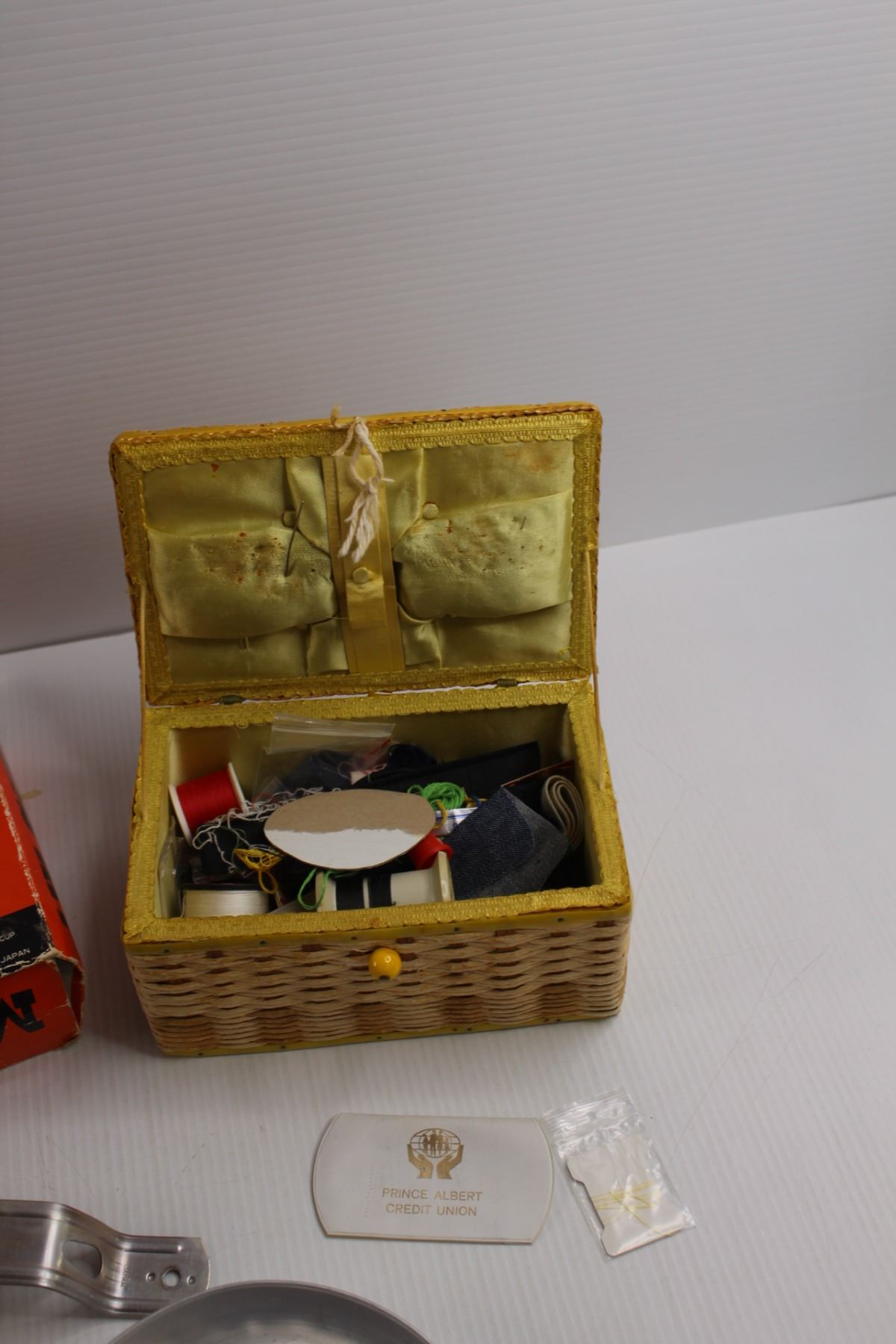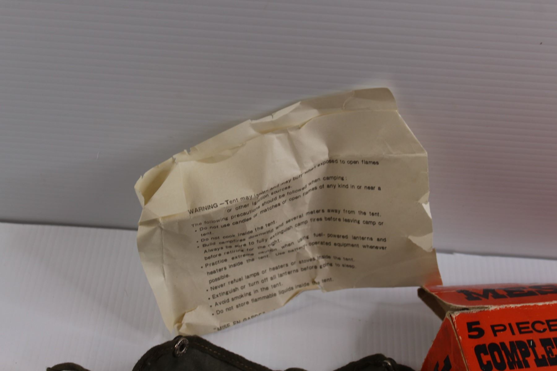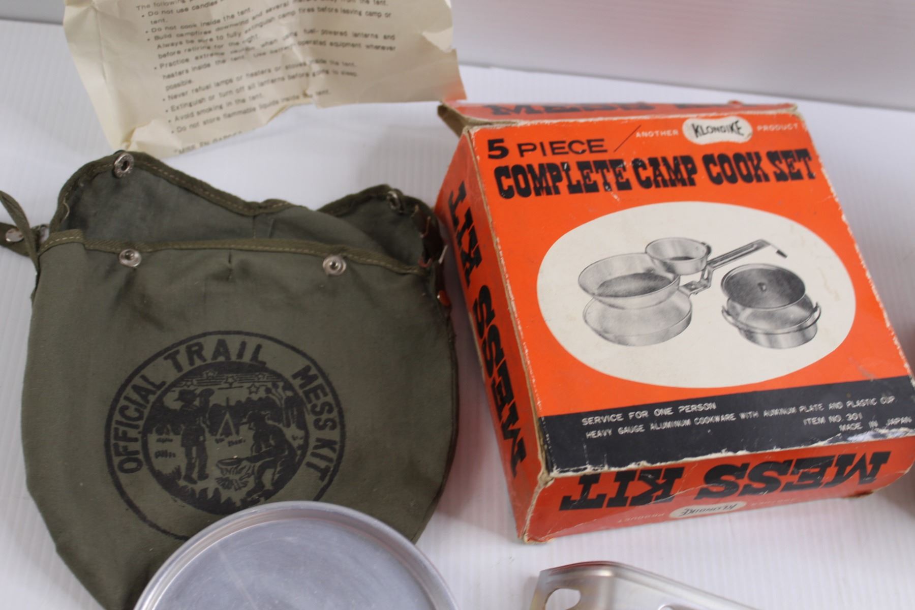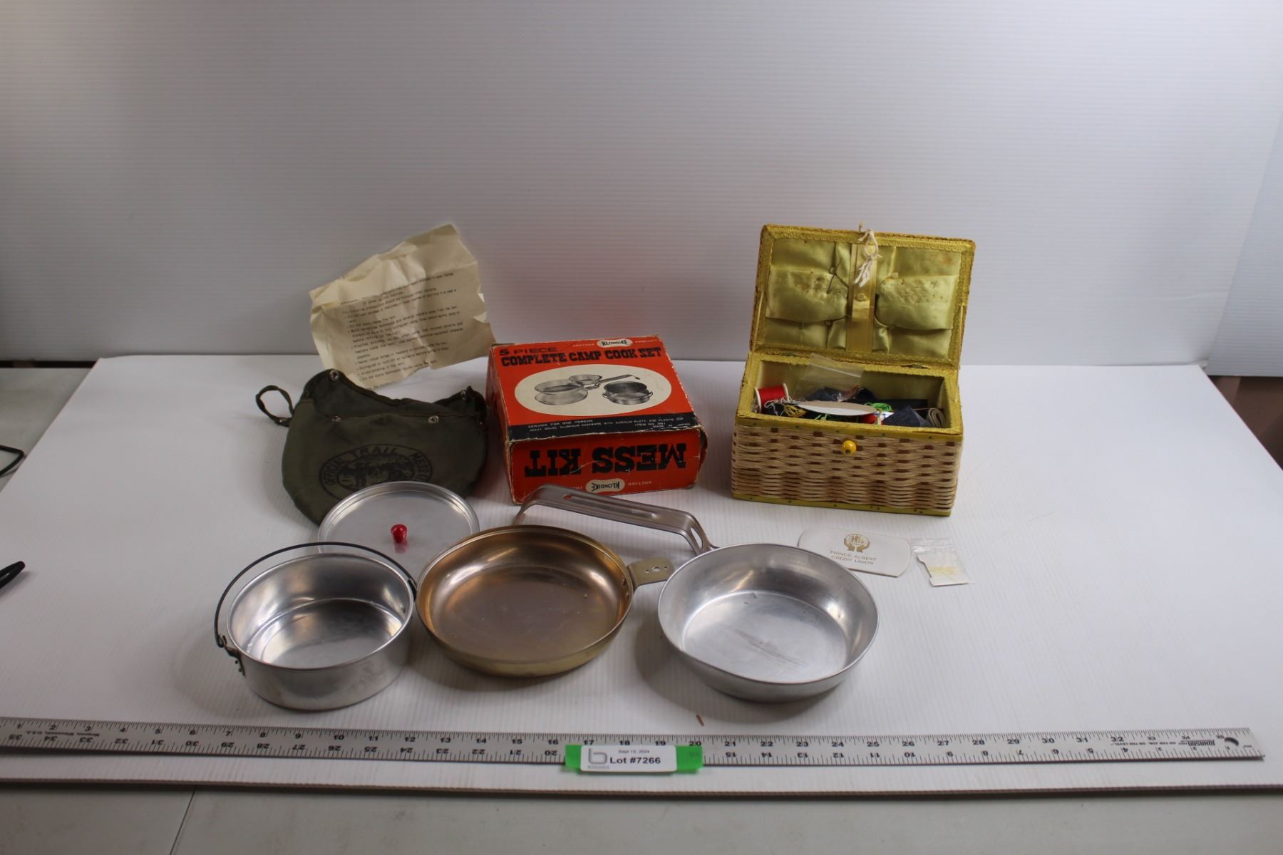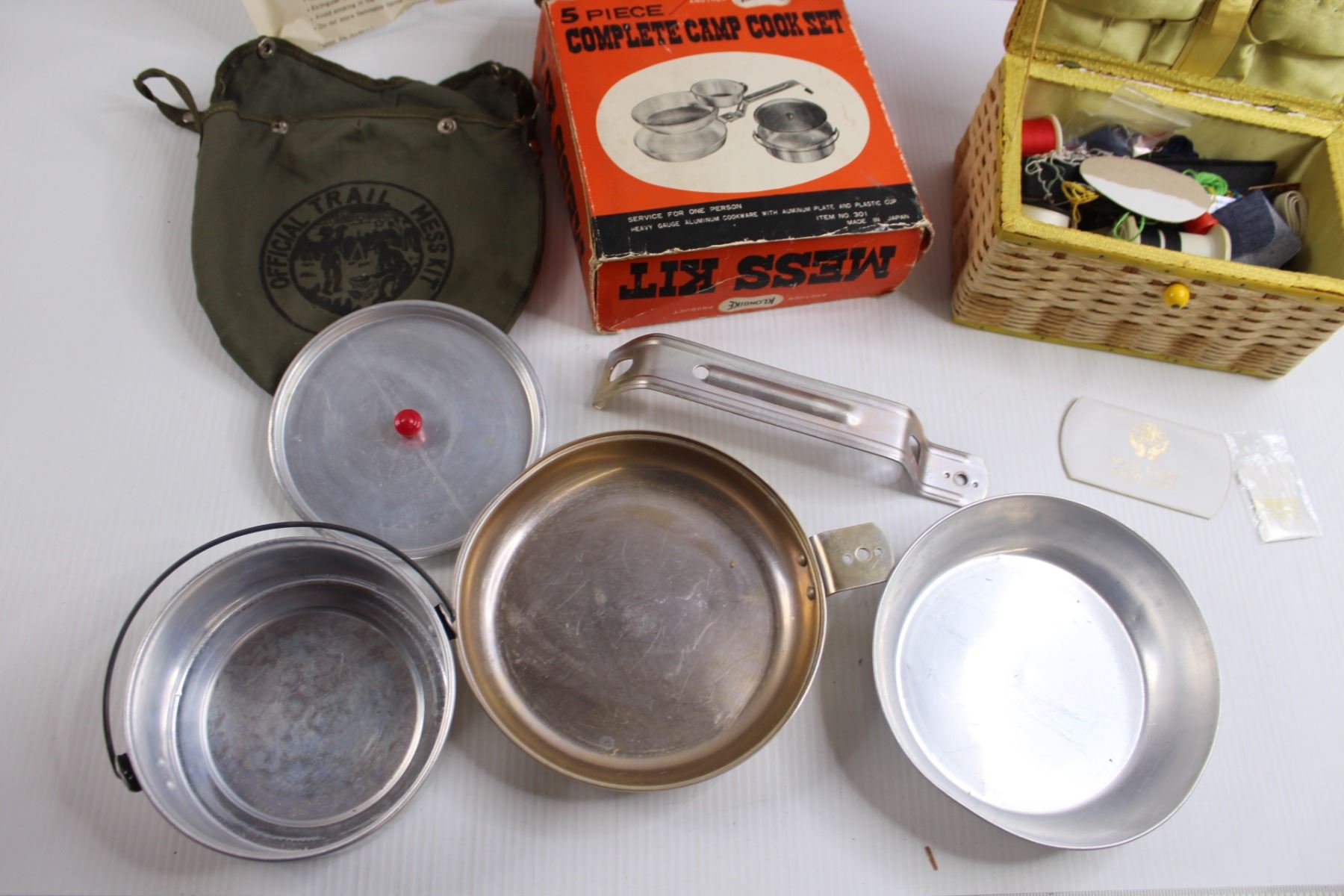 (5 pc) Vintage Camp Cook Set w/Original Box, Carry Bag (Missing Fastener for Handle) & Sewing Box w/Contents
