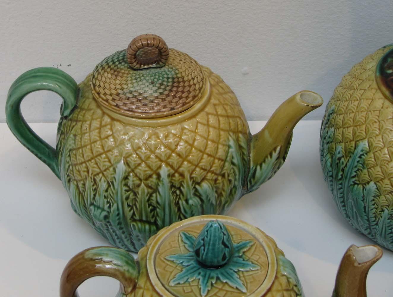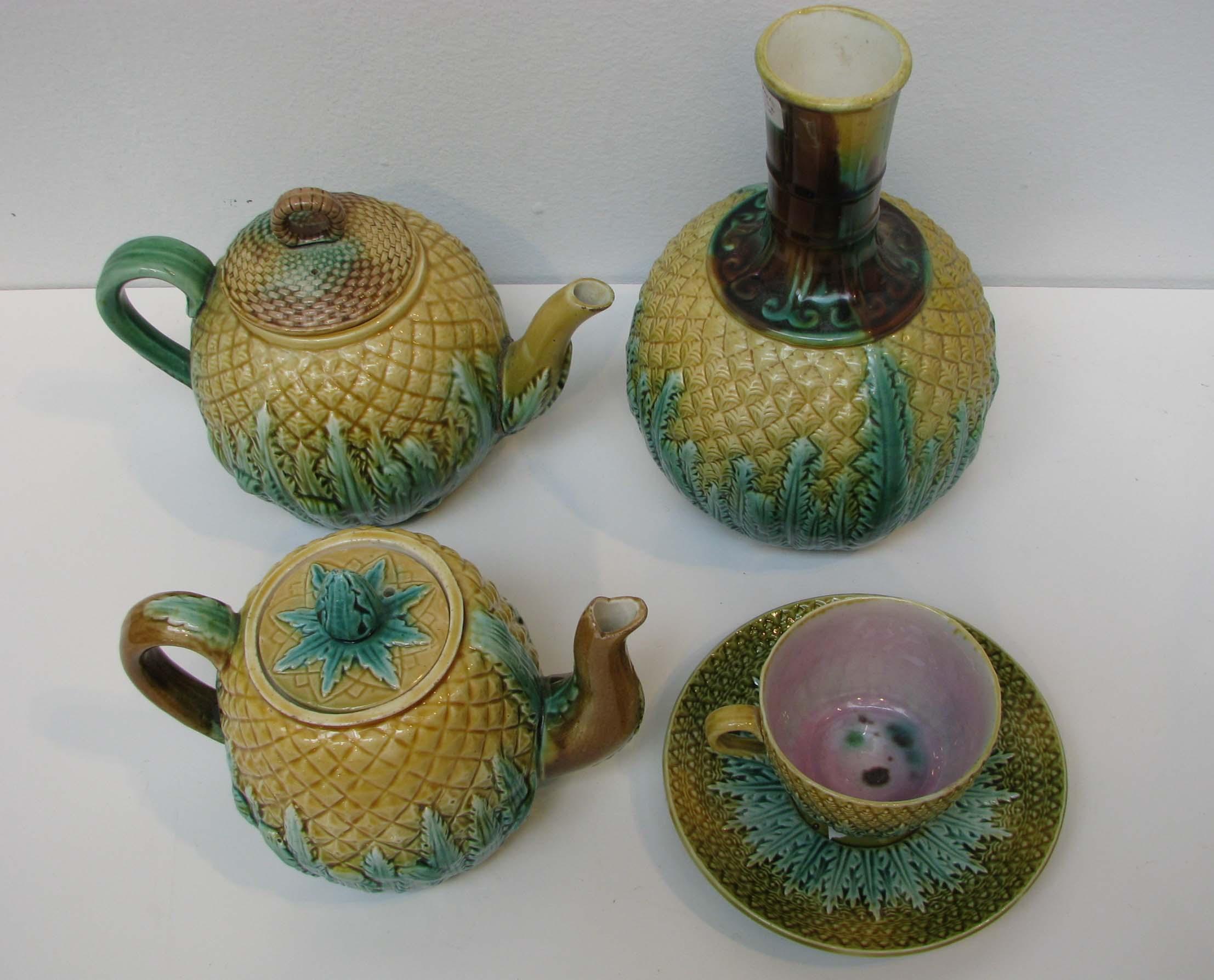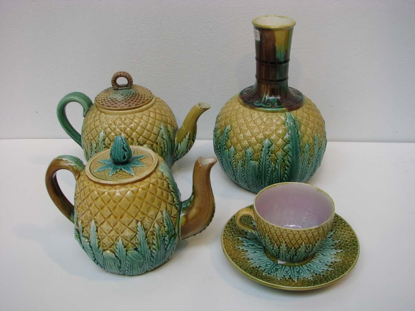 Title: 5 pcs Quilted Majolica with Pineapple Pattern including: vase, teapot, coffee pot, cup and saucer