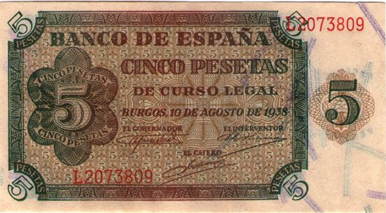 5 pesetas. 8-1938. Serie L. ED-D36a. Plancha.