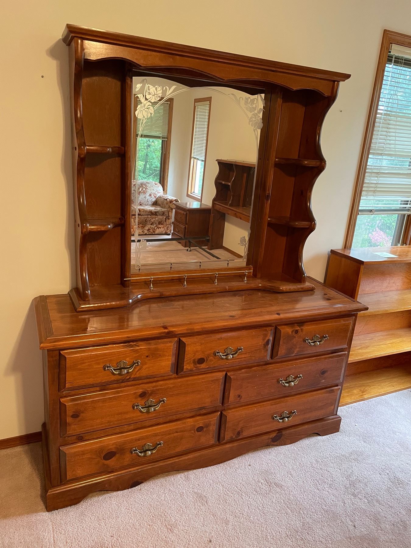 Including dresser and two side tables, bed frame and mirrored dresser.