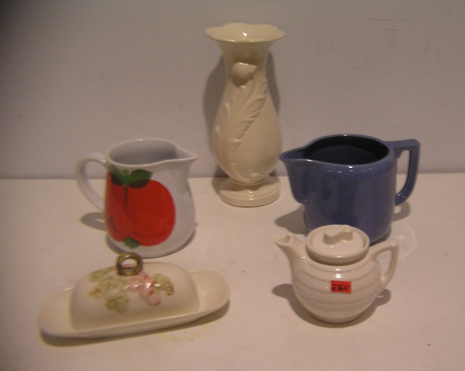 5 piece china and porcelain group includes a pot, pitcher, covered butter dish and early vase est. value $110.00-$125.00