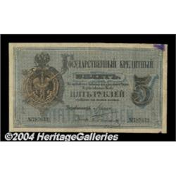 5 rubles 1882, Pick-A50. Very Good-Fine. Hand to hand mercantile dealings among the subjects of Czar Alexander III produced a few internal tears and some center top edge chipping on this 5 rubles. Almost all of these ailments have been strengthened, leaving the note still attractive. There are also ink stains in both right-hand corners, possibly left by a Muscovite bookkeeper. Important notice: Heritage usually auctions material at the rate of 200-250 lots per hour. On some occasions eBay Live bid software or the Internet may not be able to keep up with the pace of the auction. We recommend placing a realistic absentee bid now as insurance to avoid disappointment. Occasionally the auctioneer may eliminate or reject an eBay Live bid, and the auctioneer may also reopen a lot after the close of the eBay live bidding (usually because we missed an audience bid), and may reject your bid even if it shows you as the winning bidder. By bidding via eBay Live, you agree that Heritage may award the lot to another bidder at its sole discretion under the circumstances described above or any other reasonable circumstances. Also please note that all Heritage lots purchased through eBay Live carry a 20% Buyer's Premium. Please make sure you read the Terms and Conditions before you bid.
