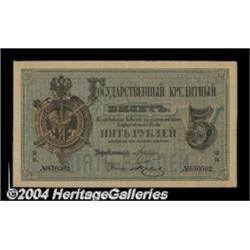 5 rubles 1884, Pick-A43. Fine. Very Fine. This type is not priced above Fine in the Krause reference and this delightful example has good coloring and a handful of folds. Important notice: Heritage usually auctions material at the rate of 200-250 lots per hour. On some occasions eBay Live bid software or the Internet may not be able to keep up with the pace of the auction. We recommend placing a realistic absentee bid now as insurance to avoid disappointment. Occasionally the auctioneer may eliminate or reject an eBay Live bid, and the auctioneer may also reopen a lot after the close of the eBay live bidding (usually because we missed an audience bid), and may reject your bid even if it shows you as the winning bidder. By bidding via eBay Live, you agree that Heritage may award the lot to another bidder at its sole discretion under the circumstances described above or any other reasonable circumstances. Also please note that all Heritage lots purchased through eBay Live carry a 20% Buyer's Premium. Please make sure you read the Terms and Conditions before you bid.
