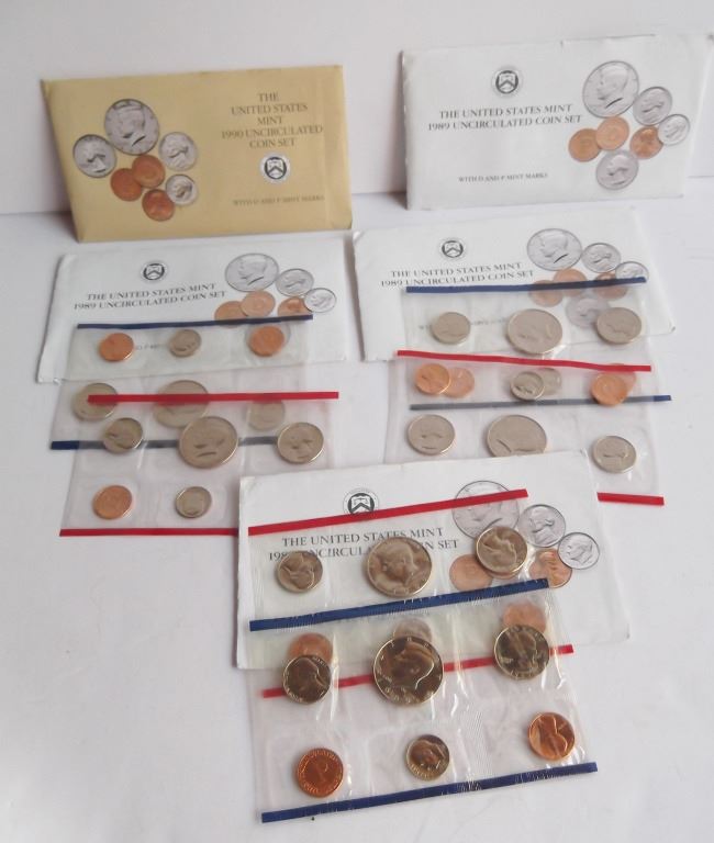 5 sets of United States uncirculated coins, years include 4 1989 & 1 1990. a couple lacking papers.