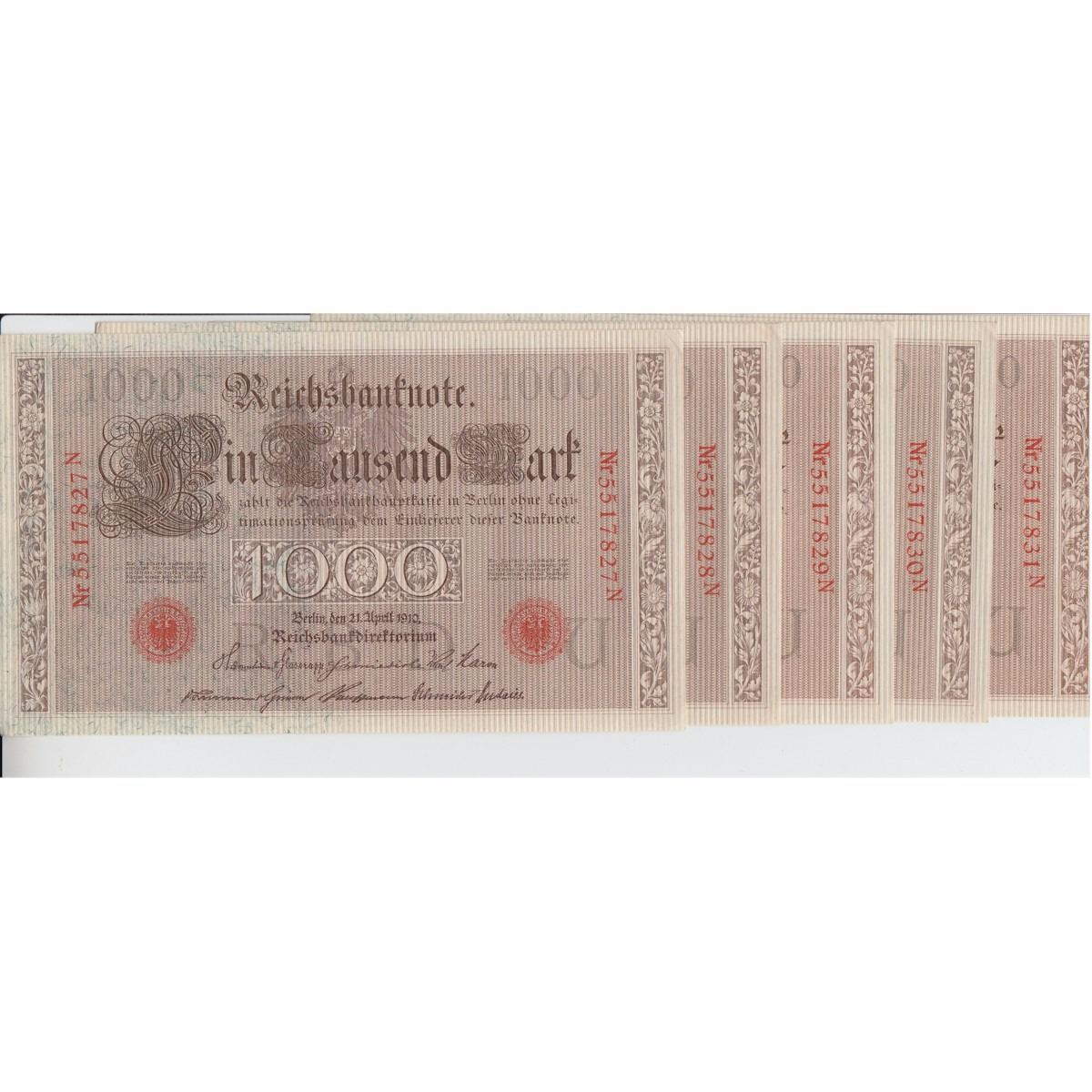 5 x 1910 1000 Mark Banknotes from Germany with consecutive serial numbers in UNC Condition. Serial Numbers 5517827 to 5517831