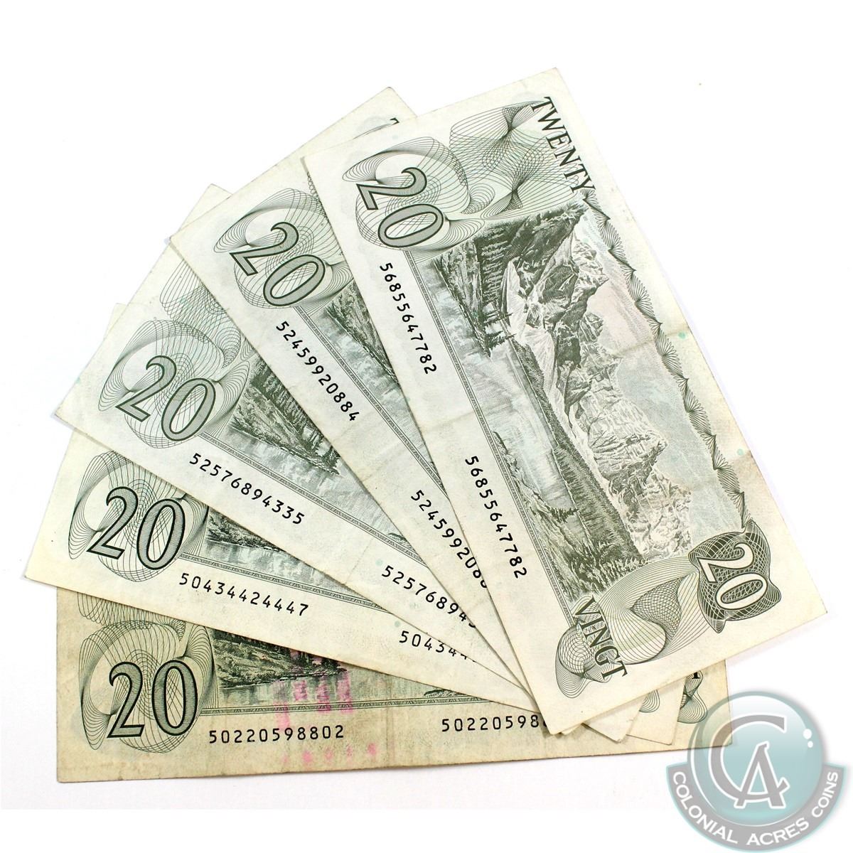 5 x 1979 $20.00 Notes with Various Signatures in Average Circulated Condition. 5 pcs.