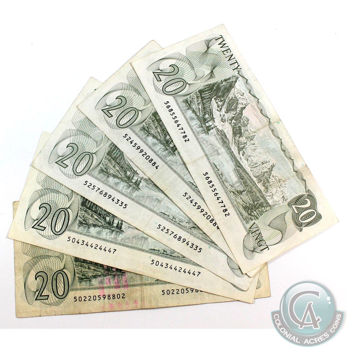 5 x 1979 $20.00 Notes with Various Signatures in Average Circulated Condition. 5pcs.
